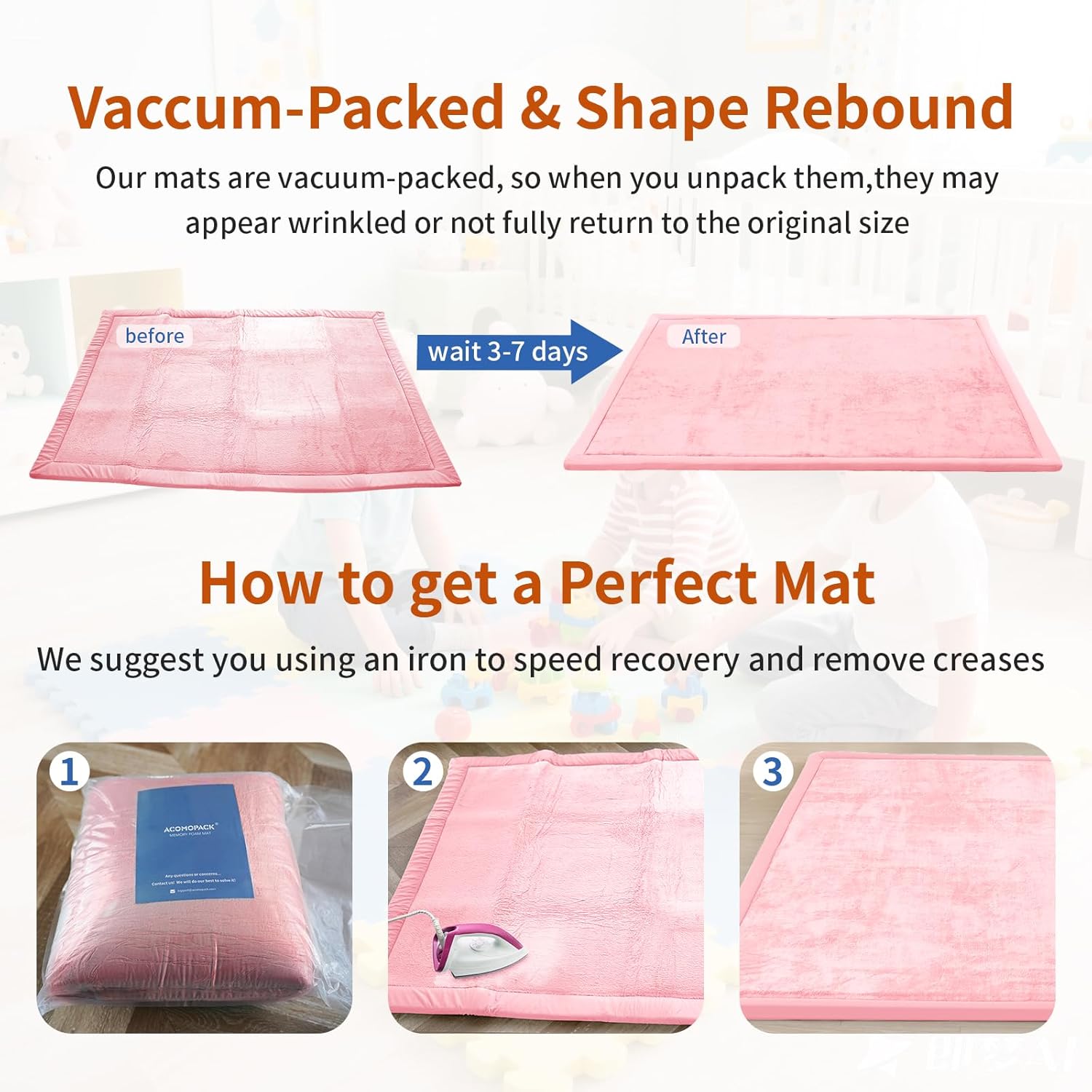 - 【Care Instructions】For more eco-friendly and safer shipping,the play rug is vacuum-packed.Upon arrival, the padded carpet may have some wrinkles or be smaller than you expected.It's normal,please allow 3-7 days for the memory foam to fully expand to its intended thickness and length. And we suggest you using an iron to speed recovery.