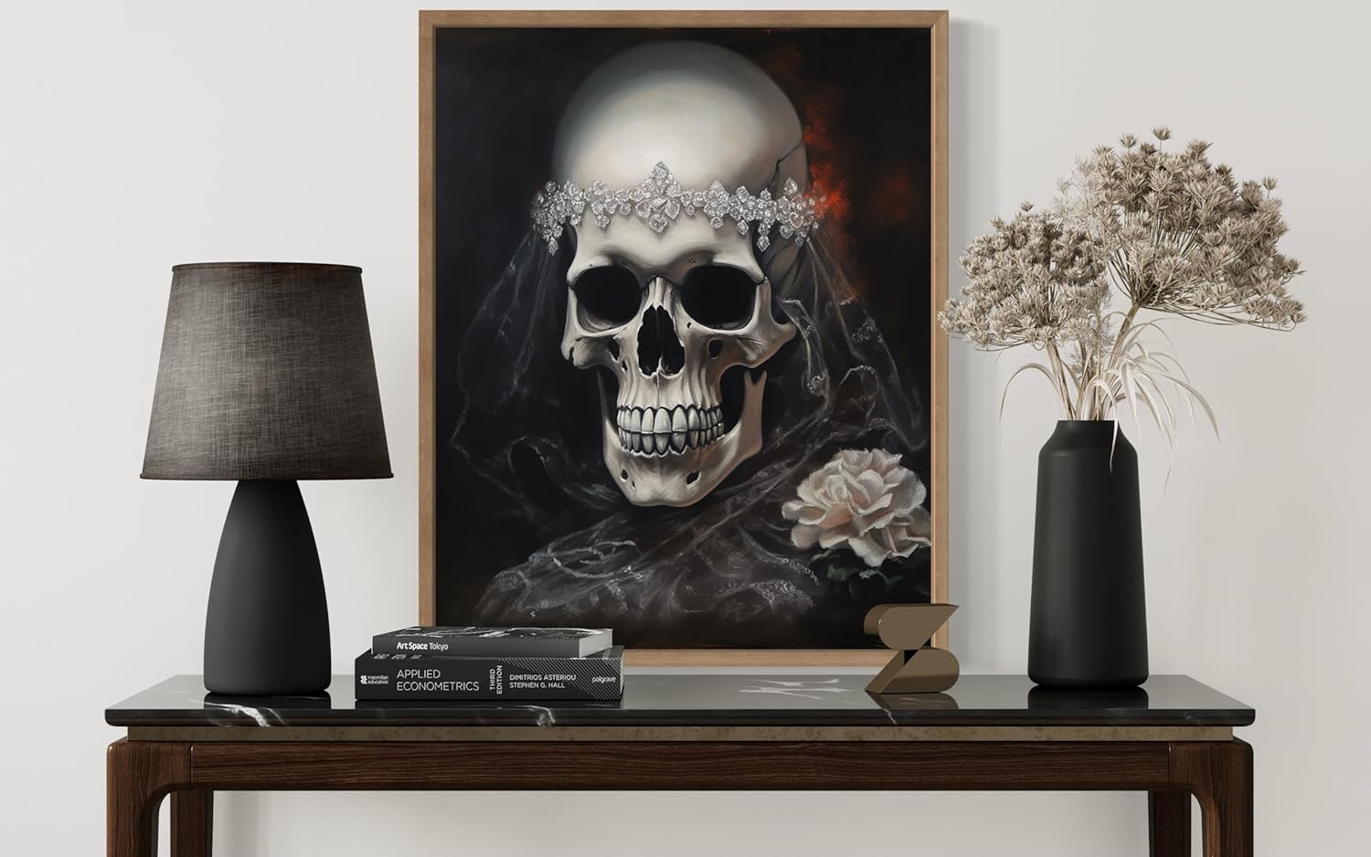 Skull Bride Poster Art Print, Halloween Scary Vintage Wall Art Academia Spooky Painting Decoration for Horror Prints, Gothic Posters Bedroom Decor 89 (Skull Bride, 11 x 14 inches, Wood Frame)