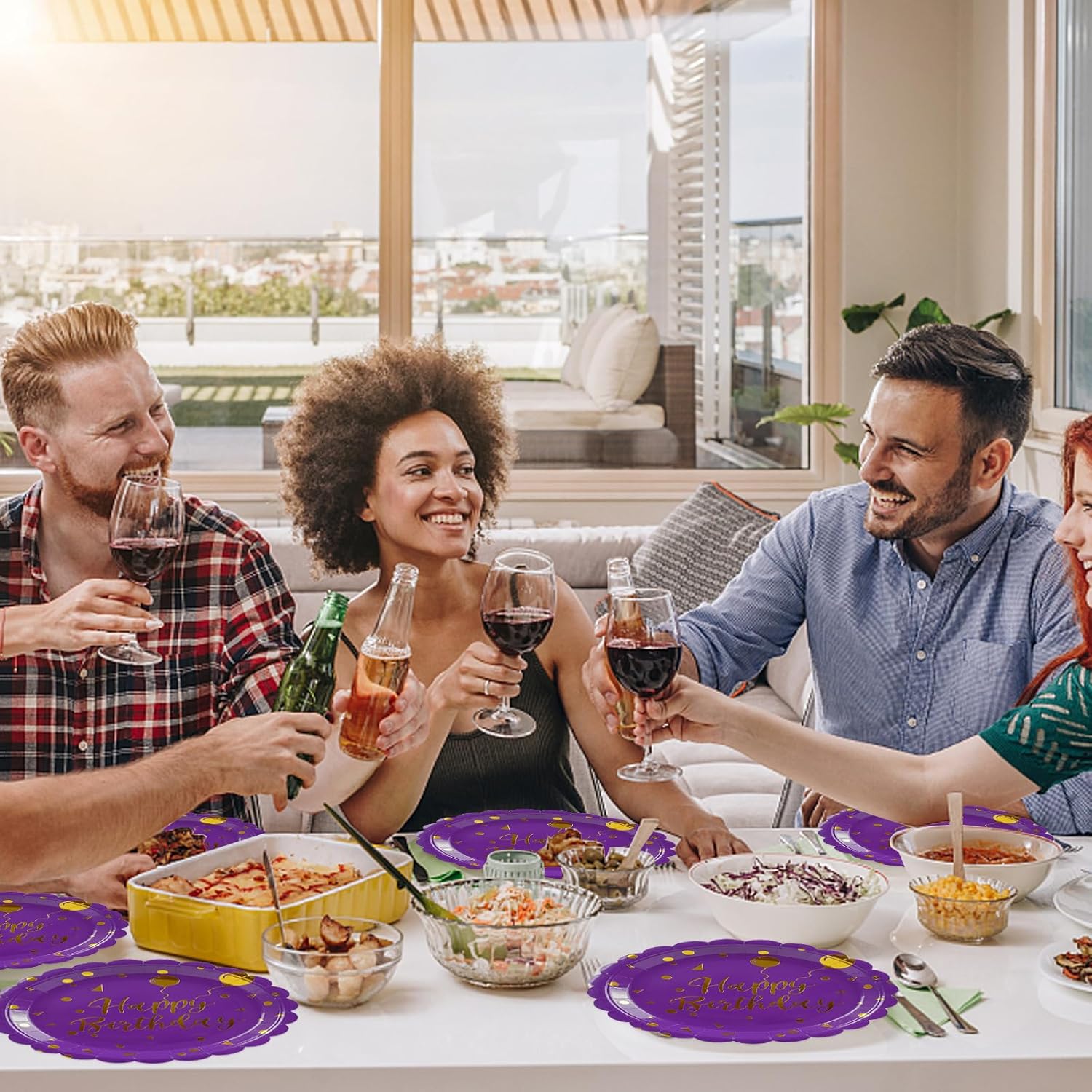 - 【EXQUISITE DESIGN】:Eye-catching gold foil stamping of 'Happy Birthday' in stylish fonts adorns these purple dessert plates and the rising balloon signifies growing goodness. It adds a touch of elegance and festivity, making your birthday party table instantly stand out.