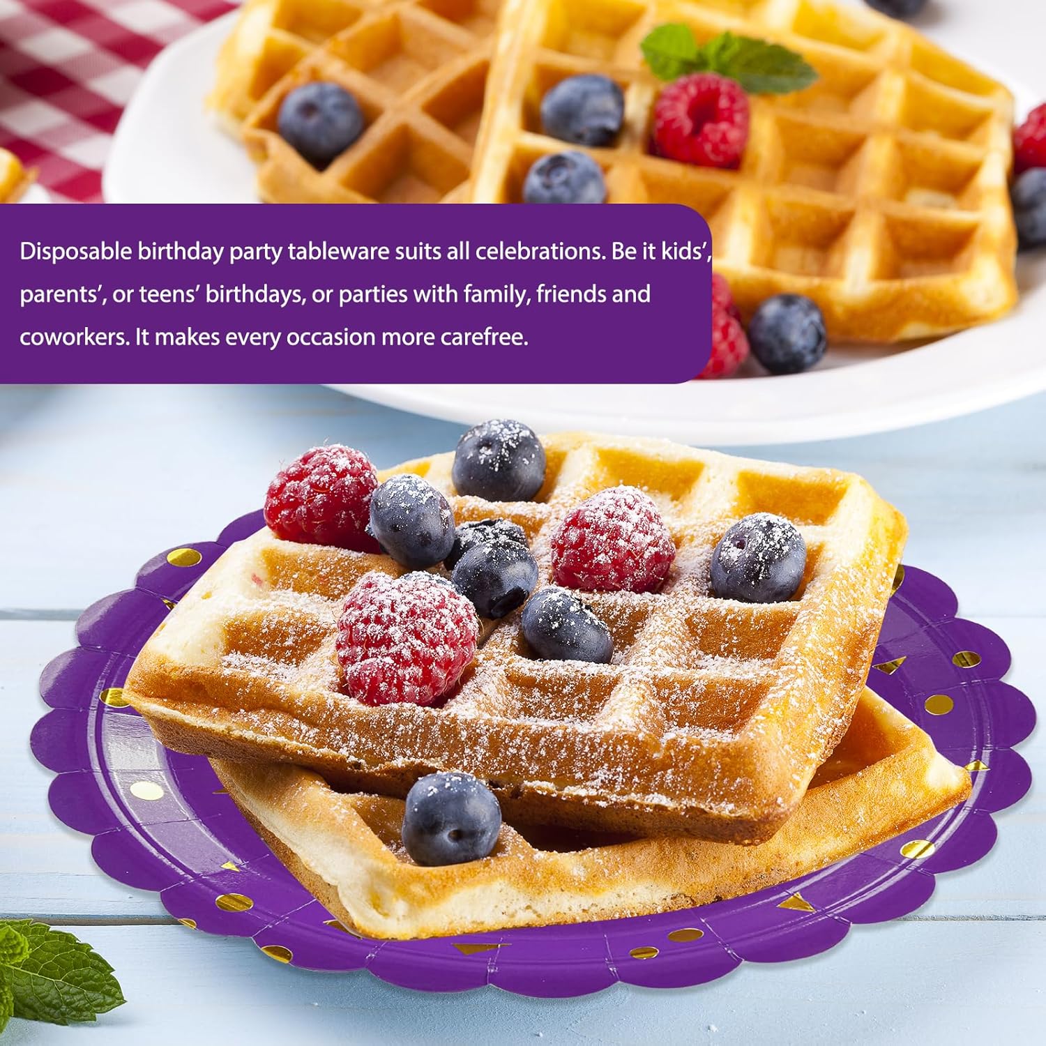 50PCS Purple Birthday Party Plates Decorations, 7 Inch Scalloped Purple and Gold Paper Plates Disposable Happy Birthday Dessert Cake Plate Party Supplies for Birthday's Decorations