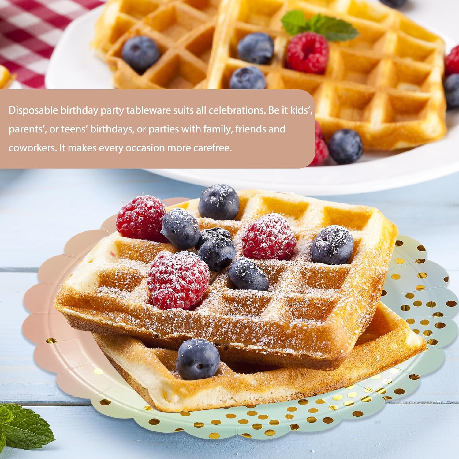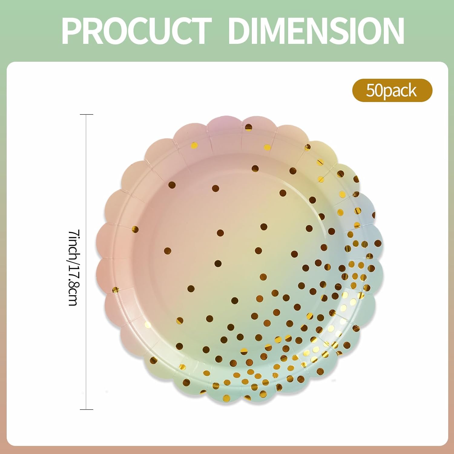 50PCS Pastel Rainbow Paper Plates, 7 Inch Scalloped Colorful and Gold Dot Party Plates Disposable Dessert Plate Cake Plate Pastel Party Supplies Decorations for Birthday Aniversary