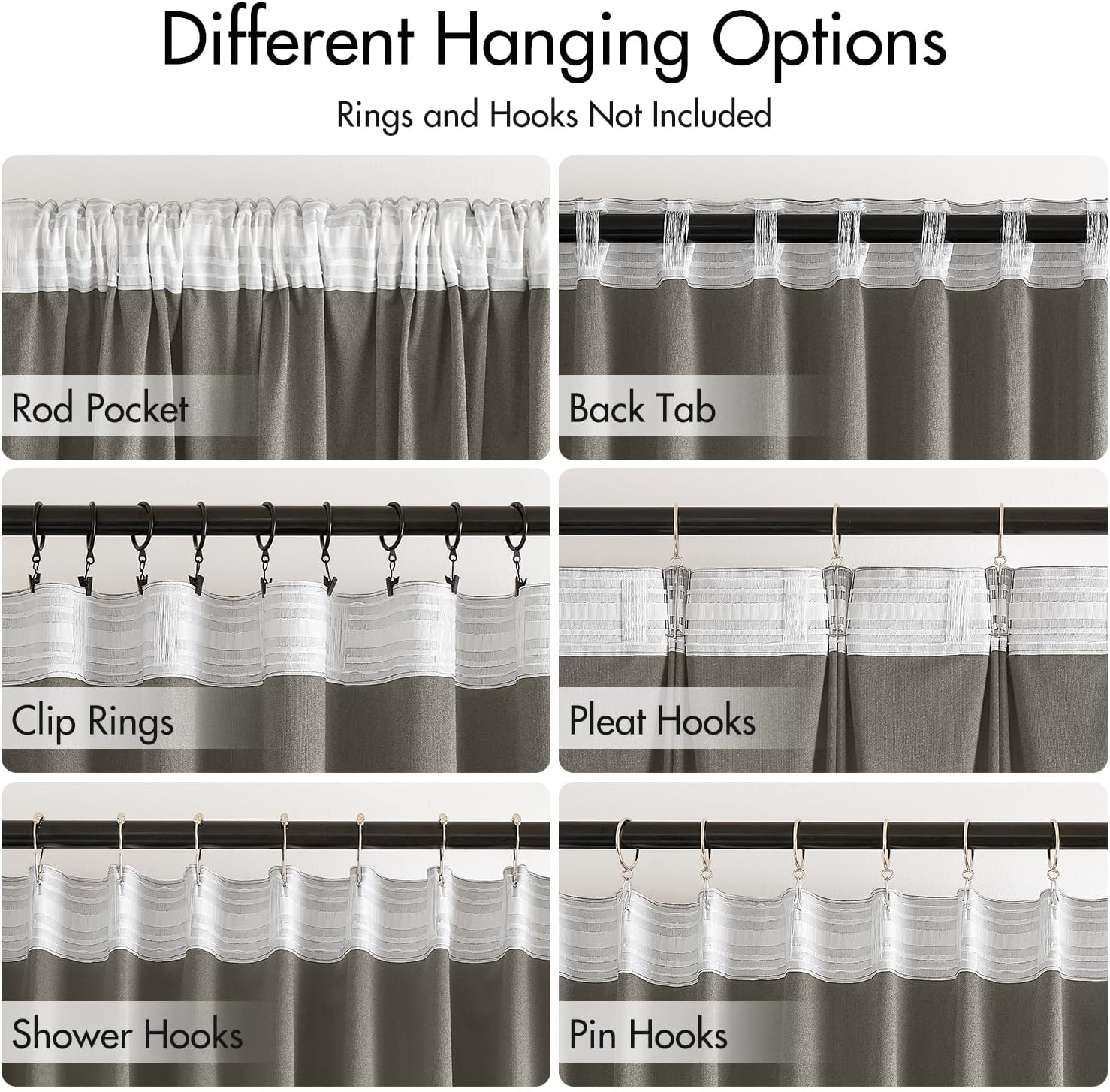 - HANGING OPTIONS: Each curtain panel has 3-in-1 top style design: rod pocket, back tab and pinch pleat. Back loop (2.3 inch) and rod pocket (3.1 inch) fit most standard rod. Curtains also can be hung with clip rings or curtain hooks. 3 ways to meet your various needs.