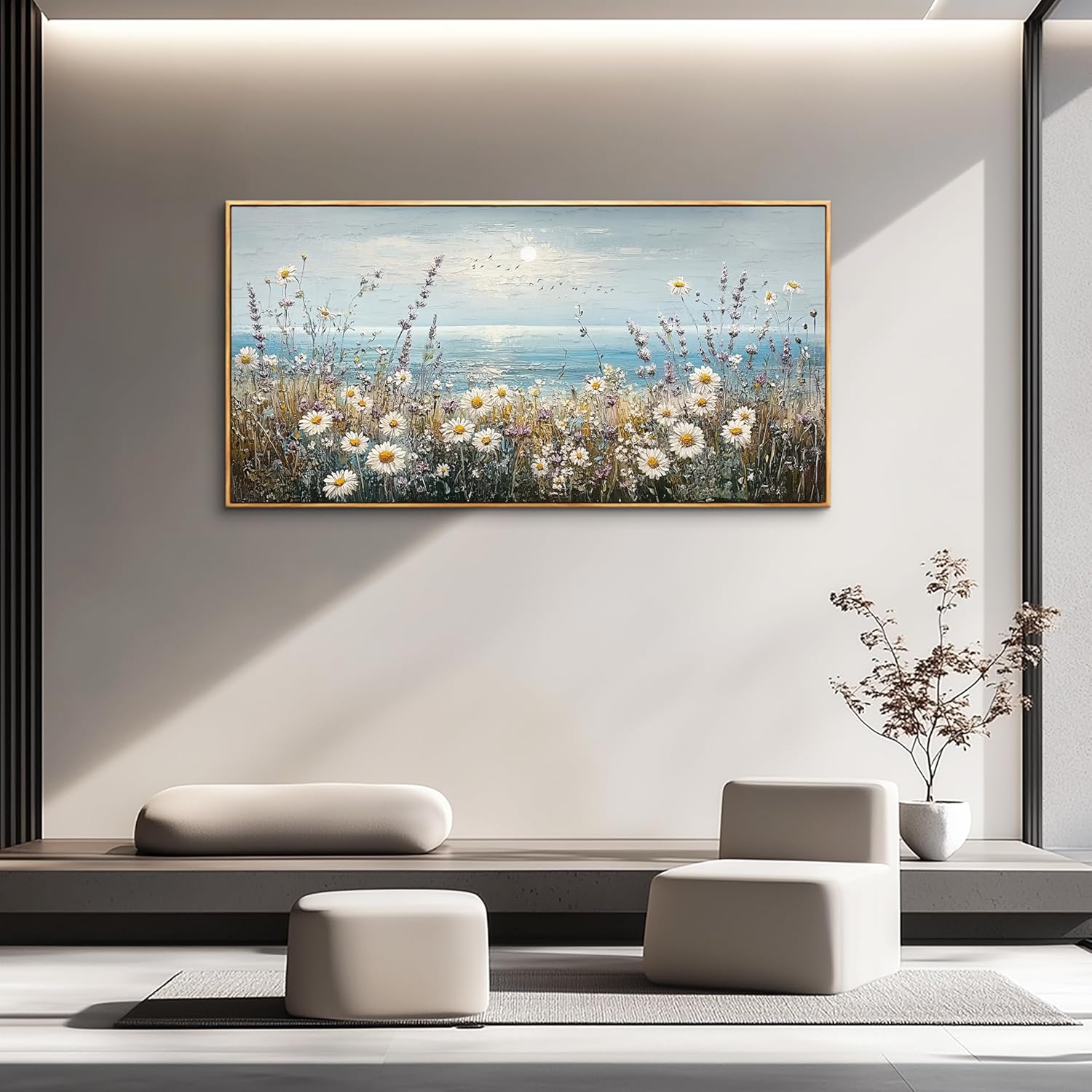PHAOHUAXM Large Canvas Wall Decoration For Living Room Wall Art For Bedroom Office Decorations Blue Ocean Paintings Flowers Watercolour Wall Pictures Canvas Artworks Home Decor Wood Framed 24x48 In