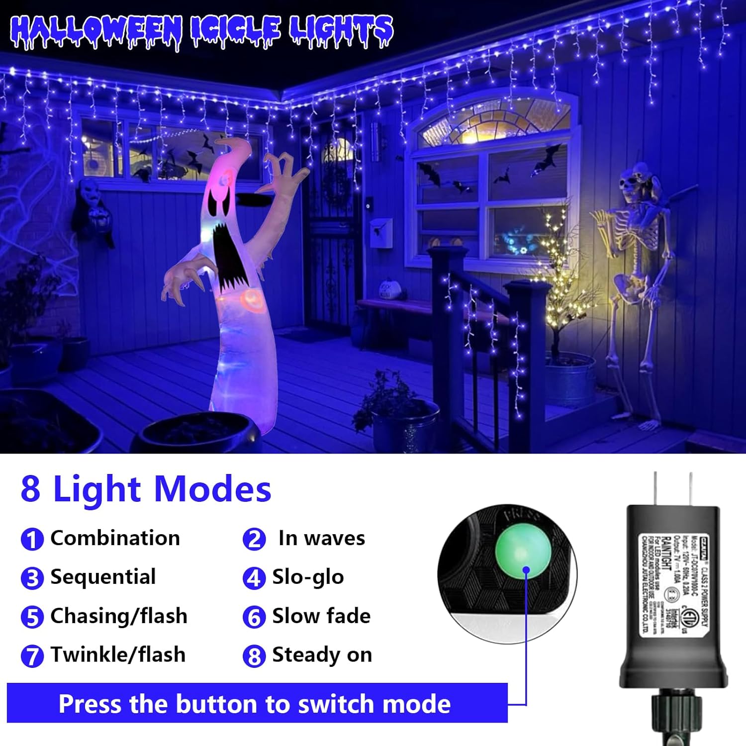 - 8 Impressive Modes Halloween Icicle Lights: There are 8 different settings(β fireflies flashing β‘ waves fading β’ chasing β£ flashing β€ fading slowly β₯ twinkle β¦ flashing β§ steady on) through the button on the back of the transformer. Different Modes add a playful touch to any occasion, you can decorate Halloween icicle lights with your family and loved ones, enjoy mysterious and horrible ambience and enrich your holiday atmosphere.
