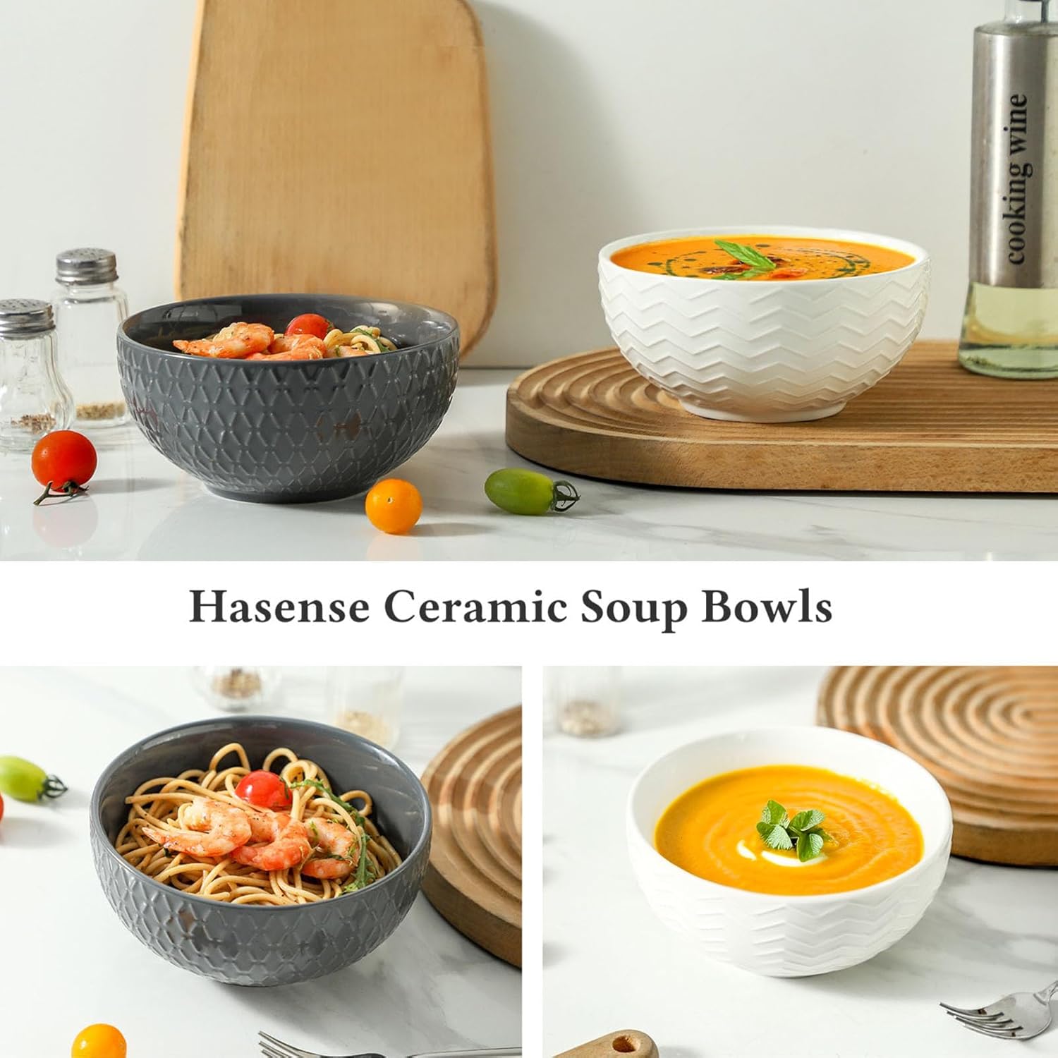 Hasense 26 OZ Soup Bowls, Ceramic Cereal bowls Set of 2 for Kitchen, Embossed Stoneware Porcelain Salad Bowls for Soup, Cereal, Oatmeal, Fruit, Microwave Dishwasher Safe, White And Gray