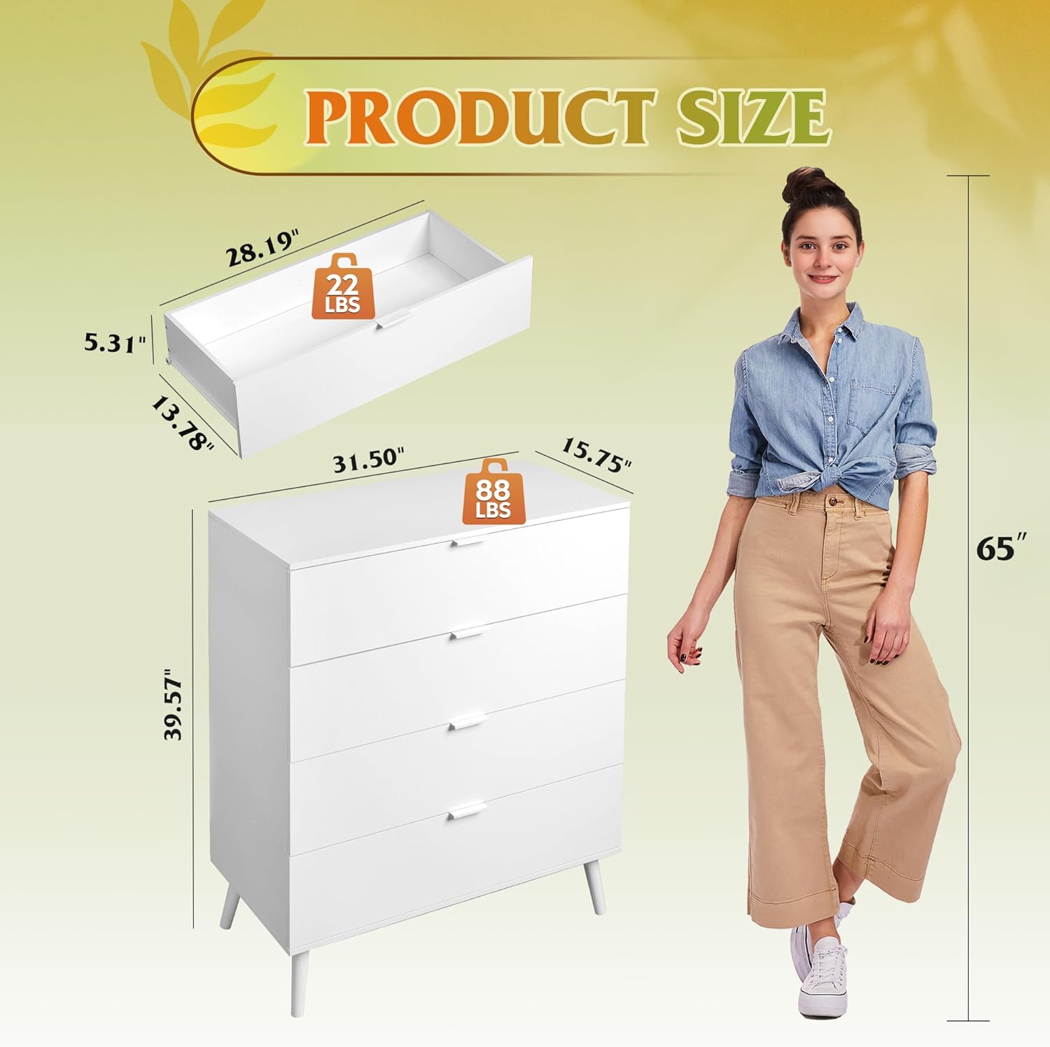 - 🏠【Modern 4 Drawers Dresser】This wooden dresser meets storage needs and is classic and atmospheric. Exquisite handle design, convenient and practical. It can be used for bedroom clothing organizer, entryway table, decorative storage for living room, making your room look cleaner and brighter.