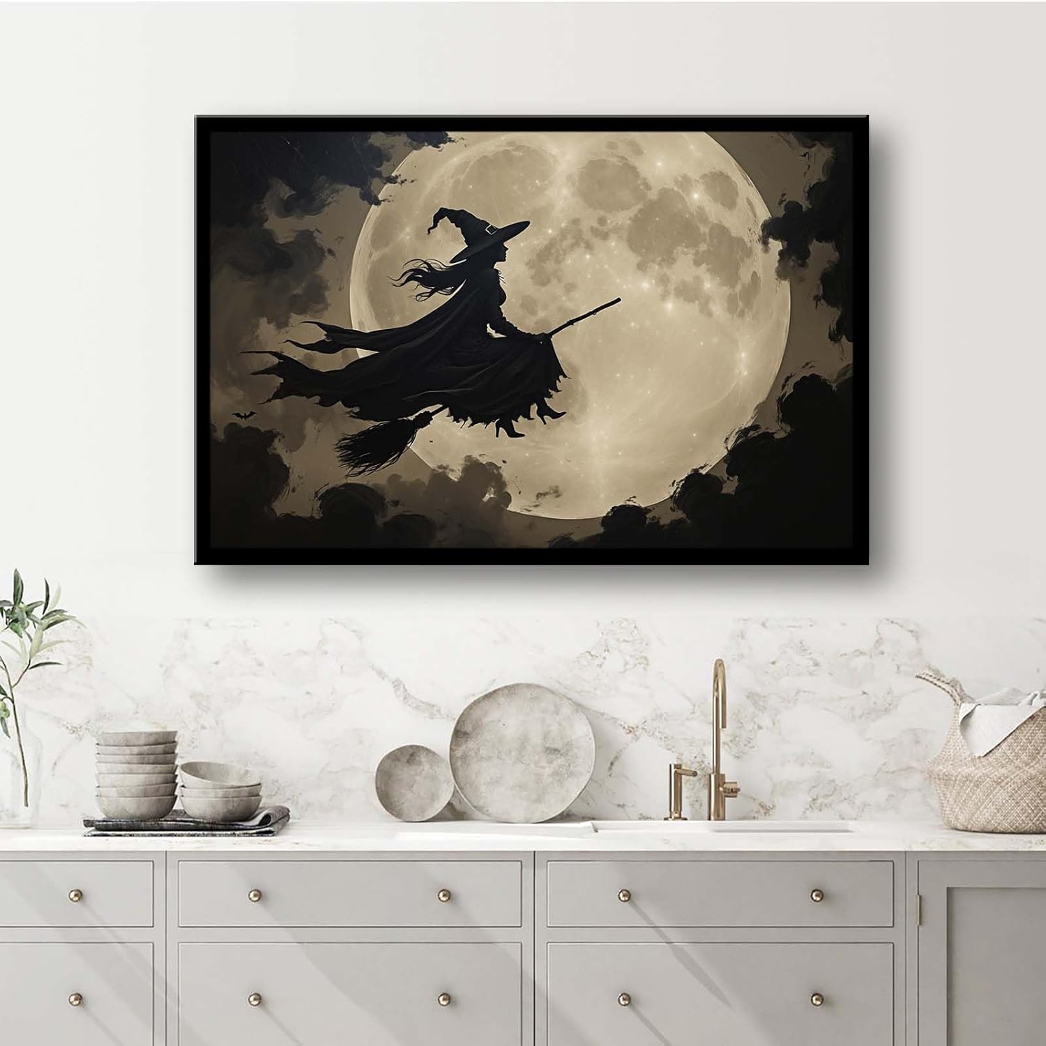 JFHCQJPK Full moon witch silhouette poster witch on magic broom Halloween mural poster decorative mural art suitable for home living room bedroom24x36in Metal blackFramed