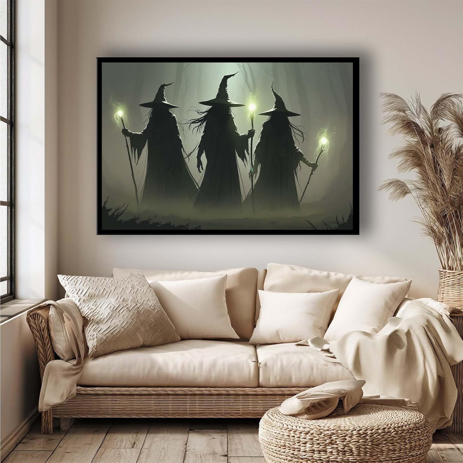 JFHCQJPK Vintage 3 witches canvas wall decor melancholy dark Halloween poster wall decor holding a staff print Gothic horror Halloween painting print for living room bedroom24x36in Metal blackFramed