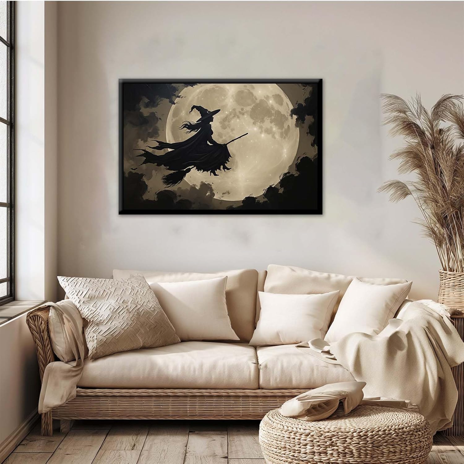 JFHCQJPK Full moon witch silhouette poster witch on magic broom Halloween mural poster decorative mural art suitable for home living room bedroom8x12in Metal blackFramed