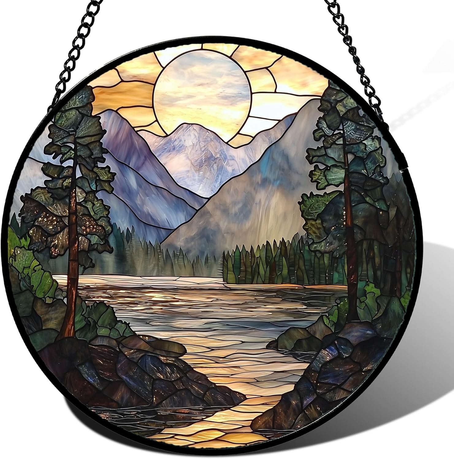Stained Glass Window Hanging, Sunset Mountains Lake Tree Sun Catcher for Window Home Decor Landscape Suncatcher Mother's Day Birthday Gifts for Women Men Mom and Nana 6.3 in