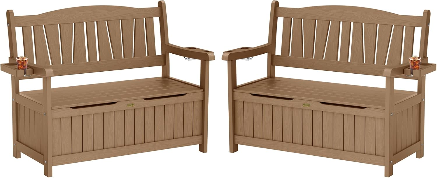 - Double Cup Holders Design & Enjoy Your Leisure Time: With two integrated cup holders, this outdoor bench with storage allows you to keep your beverages or wine glasses close at hand at any time and enjoy small moments of relaxation and leisure with your friends or family. Meanwhile, press the cup holder can fold and hide it.