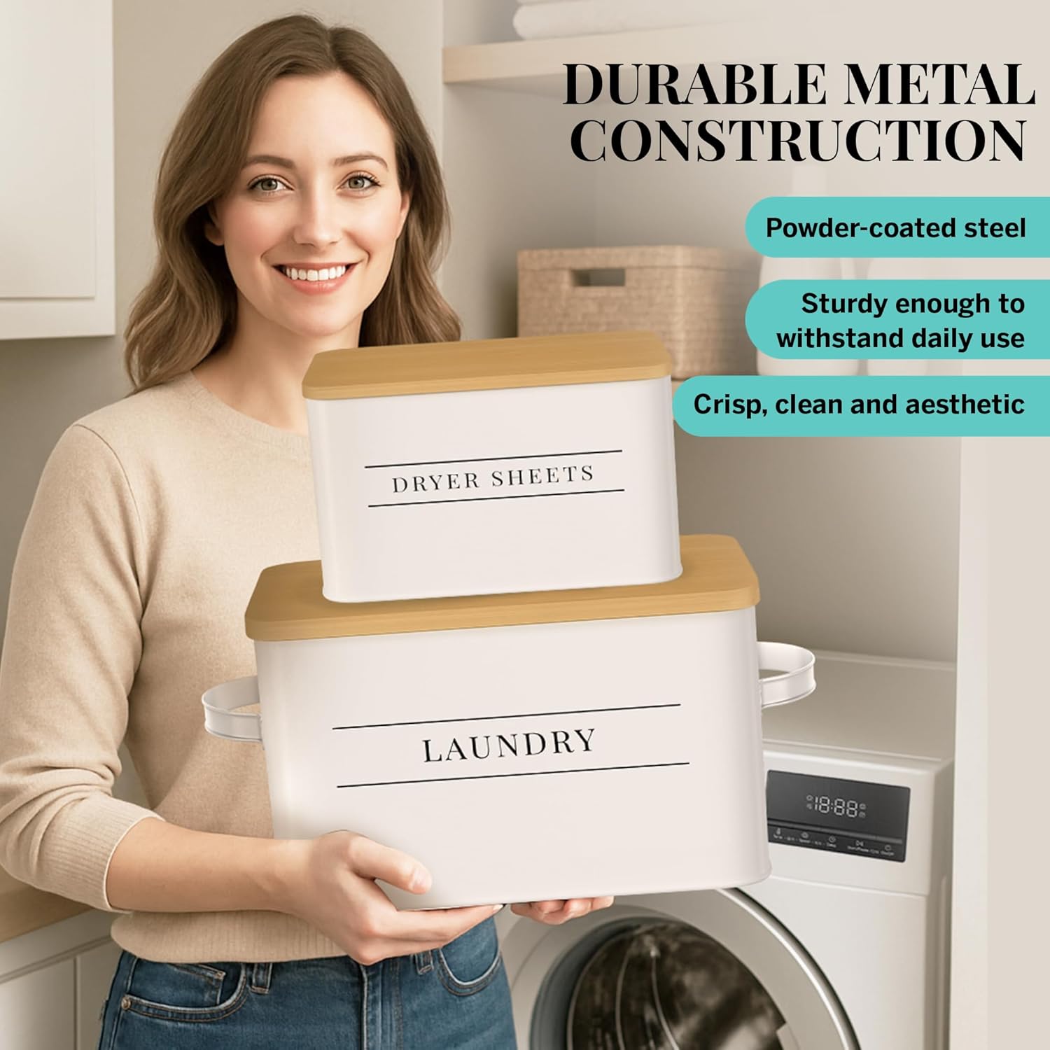 - Set of Two for Coordinated Charm – Includes two matching bins with secure-fitting lids, ideal for holding dryer sheets, scent boosters, clothespins, or other laundry essentials.