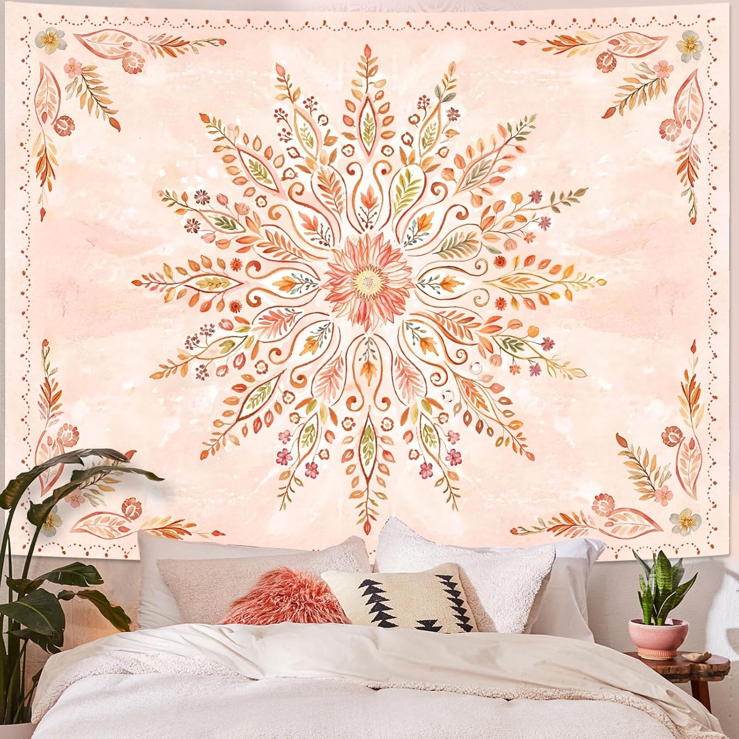- Delicate Floral Mandala Design: This Lunerfex tapestry features a beautiful floral mandala pattern with soft pink tones, adding a serene and artistic touch to your bedroom or living room.