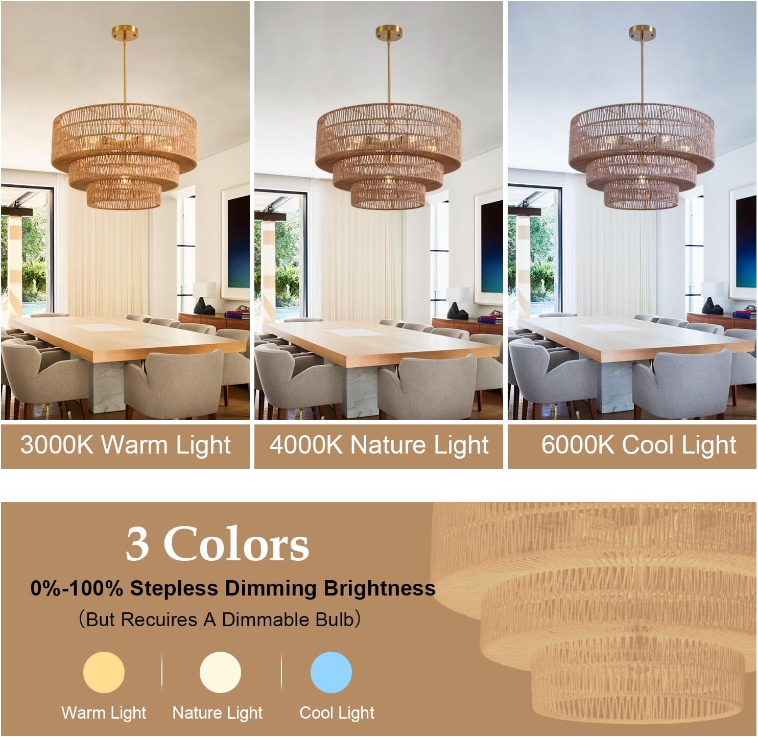 - Versatile & Safe Bulb Compatibility - Rattan farmhouse chandelier features 6* E26 sockets, accommodating bulbs like incandescent, halogen, and LED (60W Max, Not Included). Dimmable with compatible bulbs and switches.It could be dimmable if you install compatible dimmable bulbs and switch then you could install with warm white 3000k, neutral white 4000k or cool white 6000k bulbs as you like