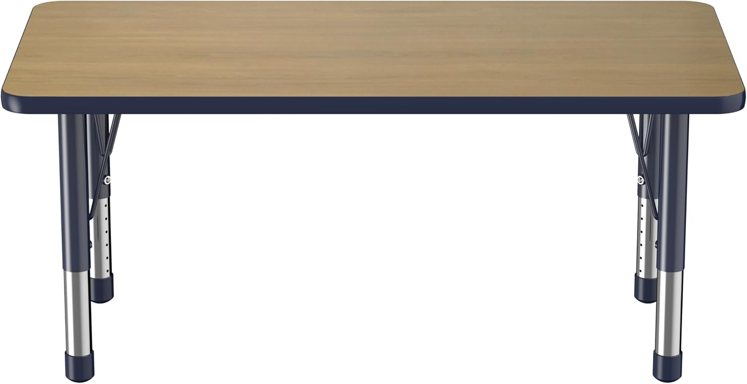 FDP Rectangle (24 x 48 inch) Classroom Table with Adjustable Chunky Toddler Legs (15-24 in); Preschool, Kinder and Daycare Furniture - Pasadena Oak Top/Navy Edge and Legs