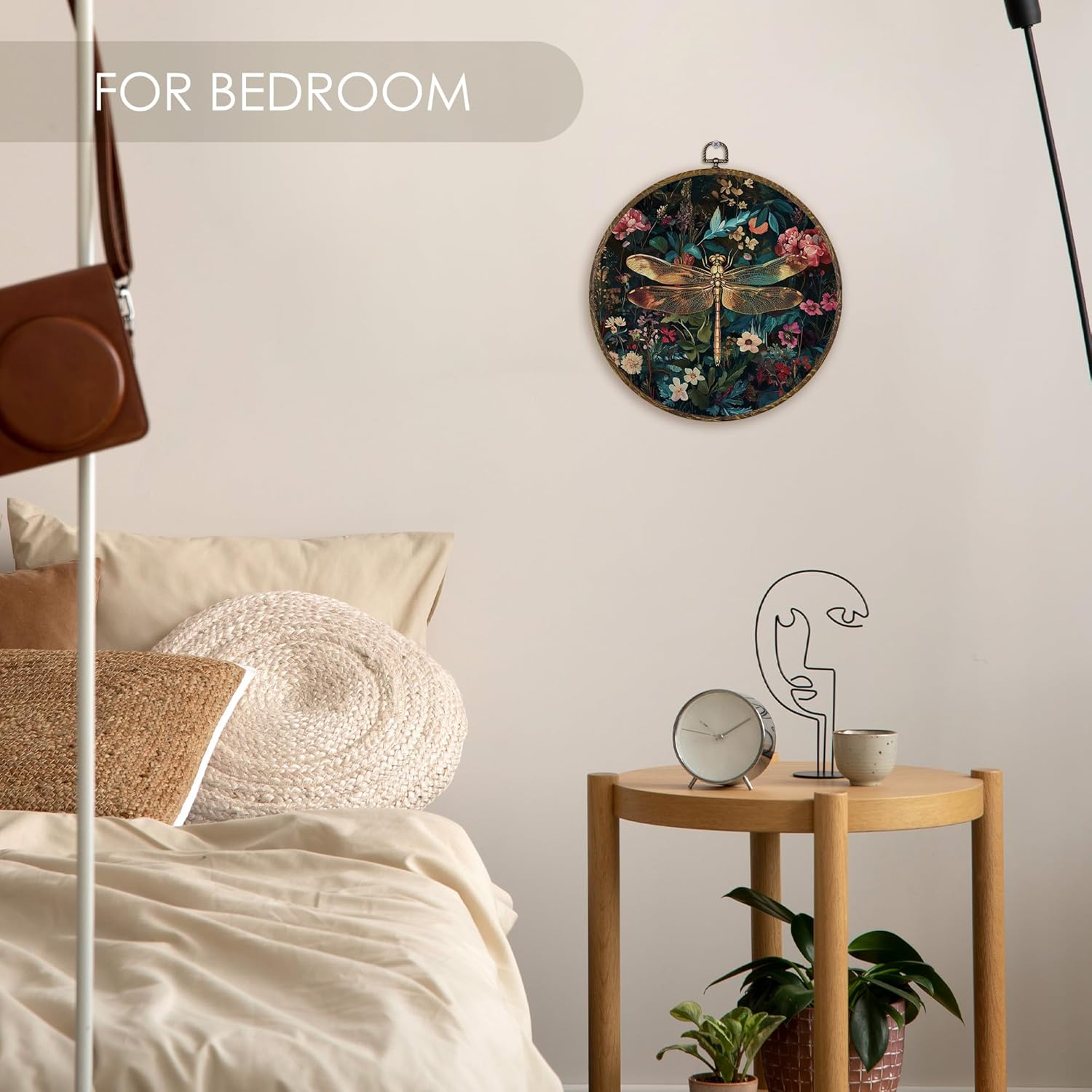 Fewgb Vintage Dragonfly Round Wall Art Decor Framed for Gallery Bedroom Living Room Kitchen Bathroom, Dark Black Floral Canvas Wall Art Prints Picture, Flower Hanging Room Decor Artwork 10x10