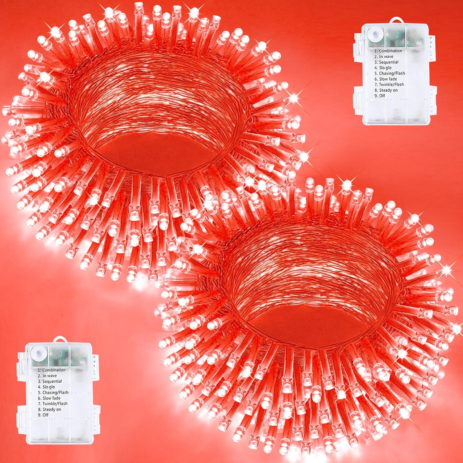 2 Pack Halloween String Lights Battery Operated with Timer, 66FT 200 LED Waterproof Battery Twinkle Lights, 8 Modes Fairy Light for Indoor & Outdoor Party Bedroom Garland Tree Christmas Decor (Red)