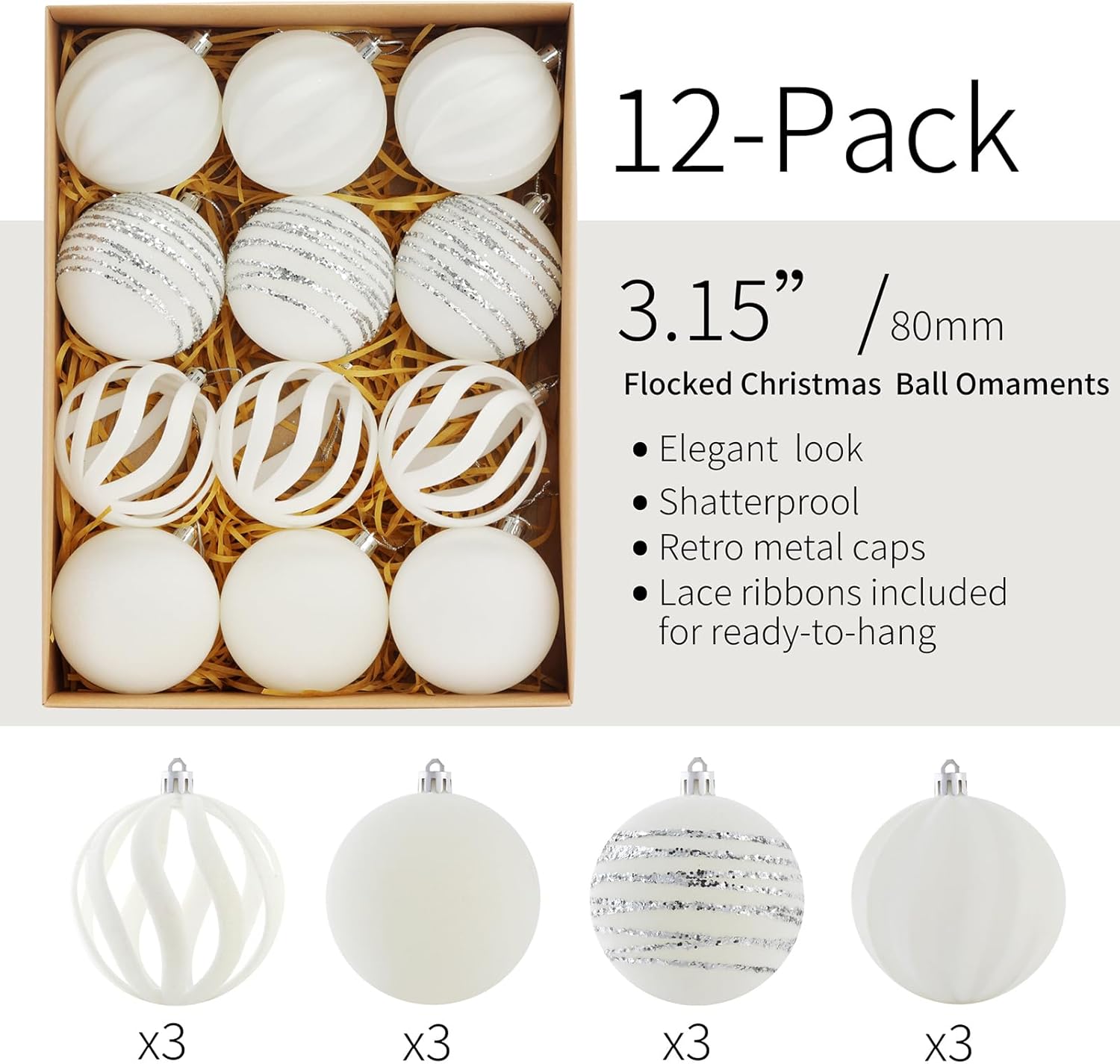 Christmas Ornaments Set of 12, 3.15" Flocked Velvet Balls with Hand Painted Designs, White Elegant Christmas Tree Decorations in Gift Box