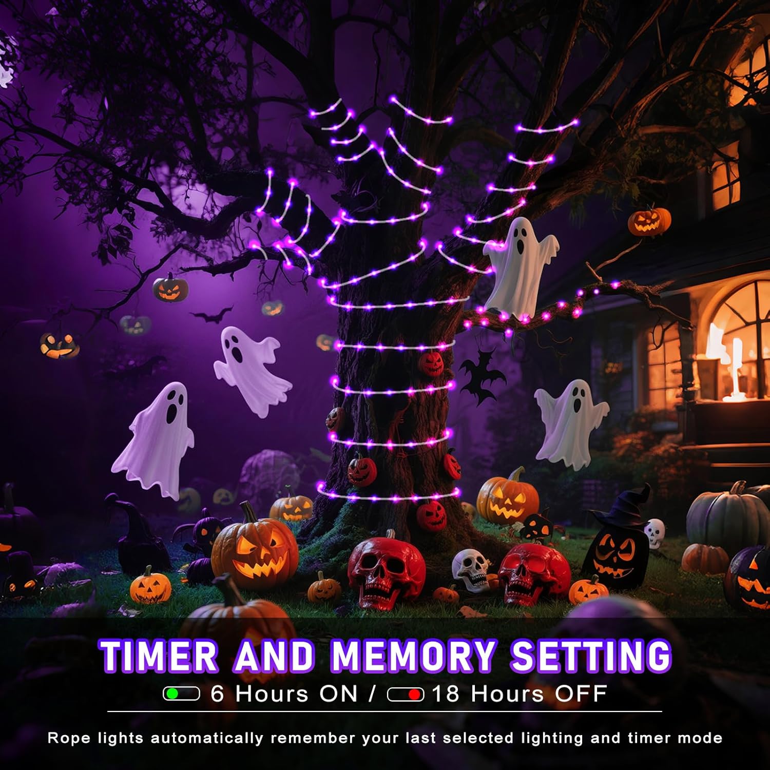 - ăFlexible and Timeră- The flexible purple Halloween lights allows you to bend the lights into various shapes to decorate any occasion. Easily wrap around trees, poles, fences, or furnitures. You can set timer, the string lights for outside will be 6 hours on and 18 hours off per day. Perfect for decorating both indoor spaces like living rooms and bedrooms.