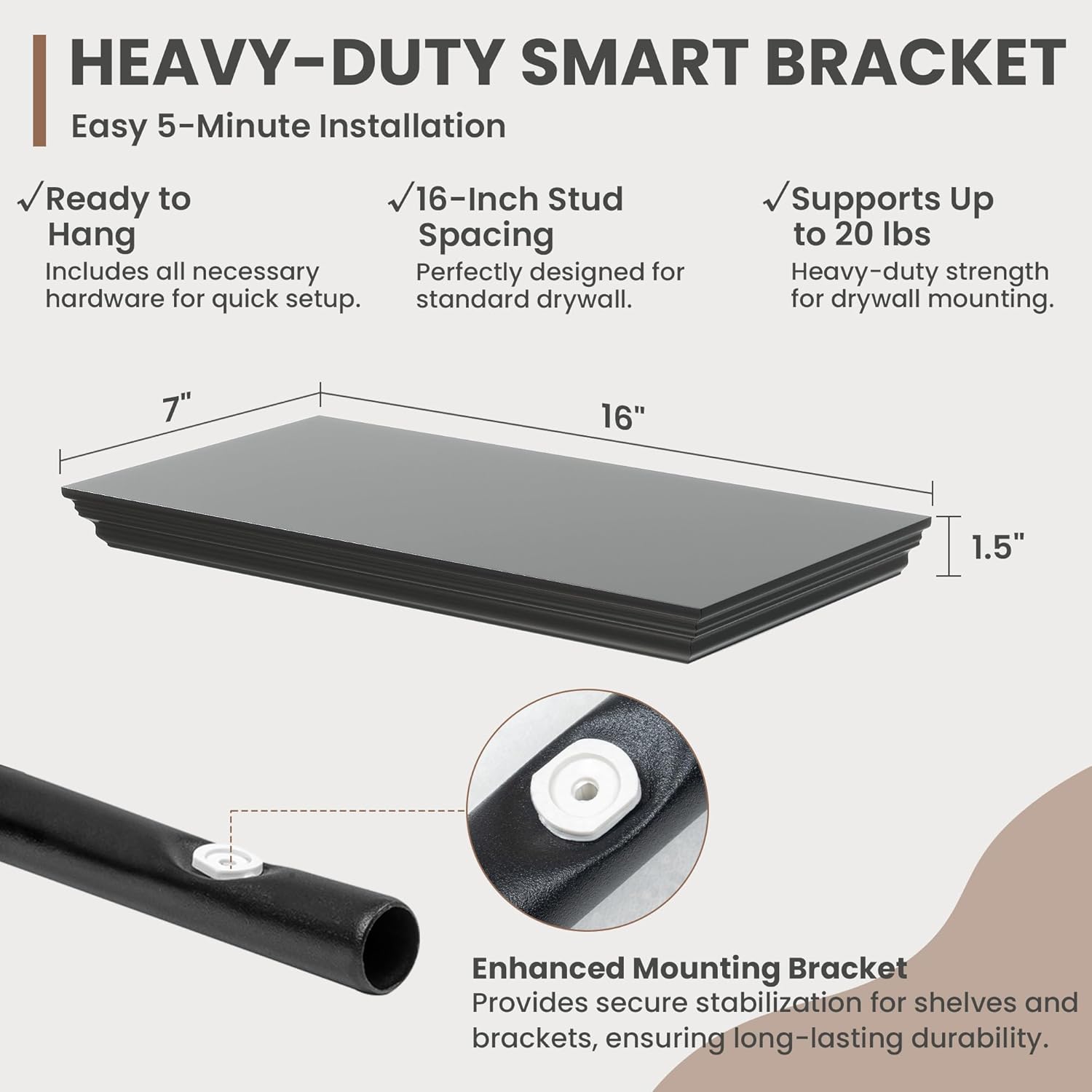 - Package Contents: 1 black floating shelf included, board dimension: 15.8" W x 6.9" D x 1.5" H. Other accessories: 1 metal brackets, 1 magnetic level, 3 wood iron connection screws, 6 wall screws and expansion tubes, and 1 installation manual