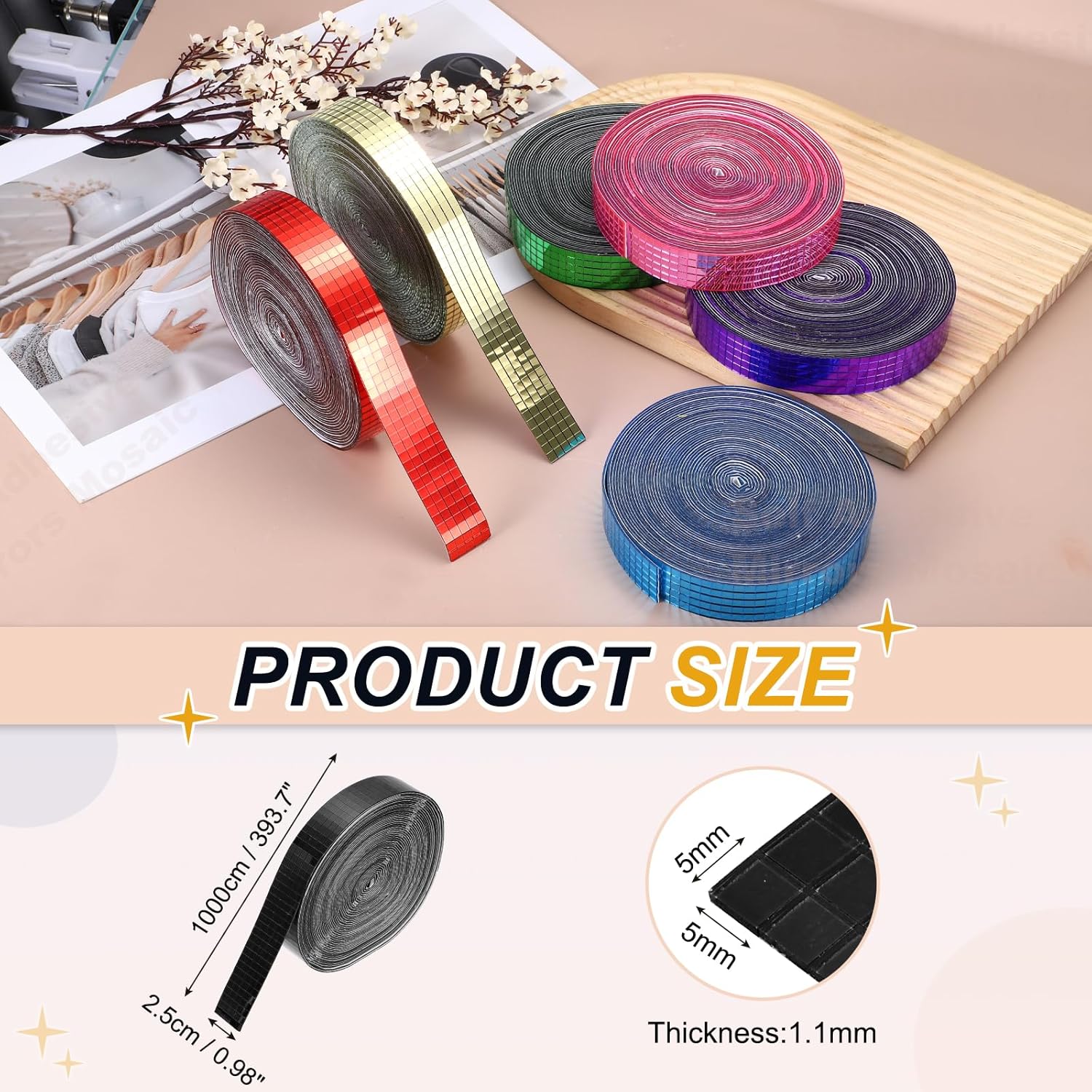 - Specification: Color: Black; Material: Glass; Size:1000x2.5cm/393.7x0.98Inch(LxW); Thickness:1.1mm/0.04inch; Each Tile Size: 5x5mm/0.2x0.2inch; Packing List: 10000 Pcs x Self Adhesive Mirrors Mosaic Tiles (Roll of 1)