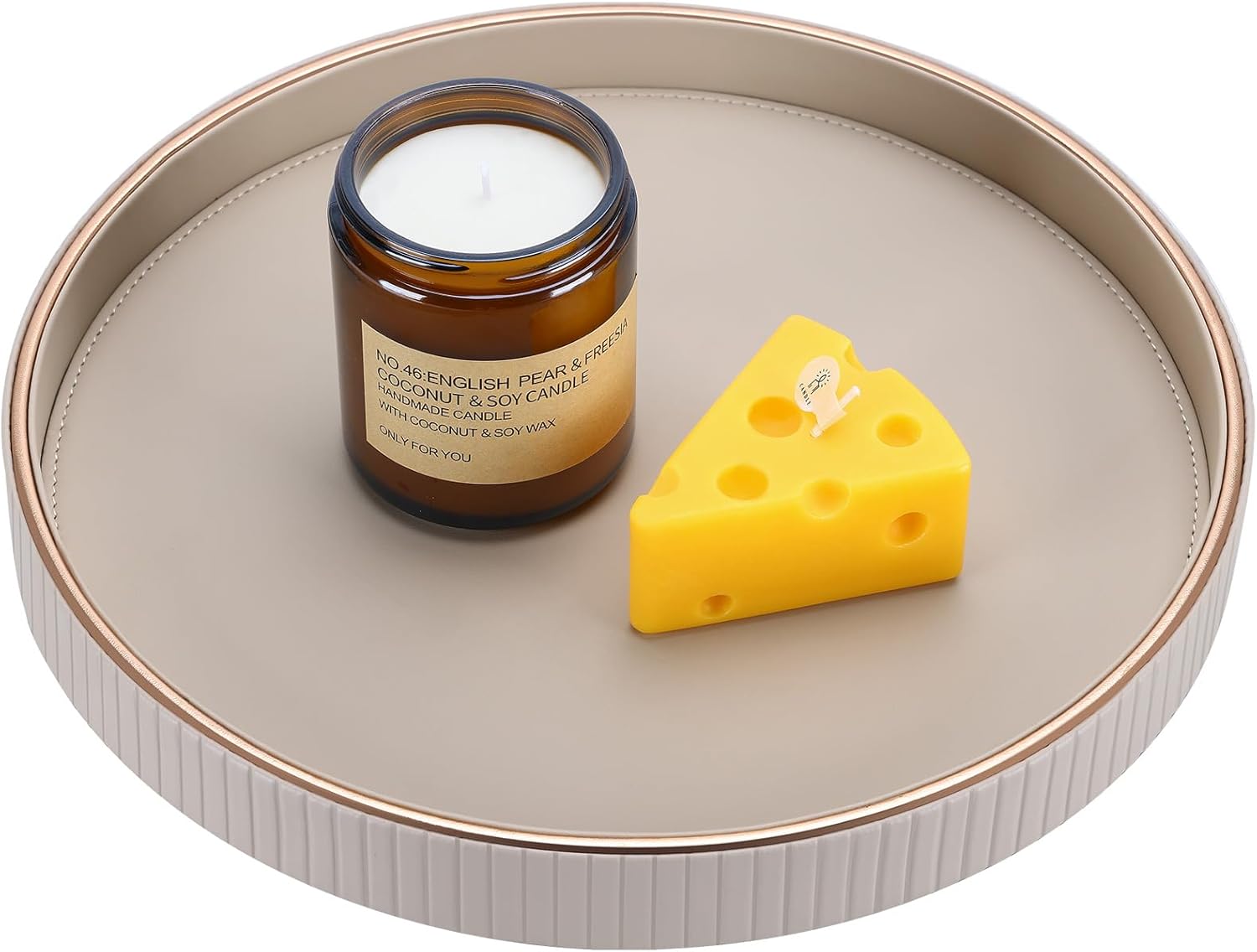 KINGFOM Decorative Serving Tray, PU Leather Valet Nightstand Desk Organizer for Men Women, Round Tray Decor for Coffee Table/Home Decor, Modern Decorative, Centerpiece (Beige)