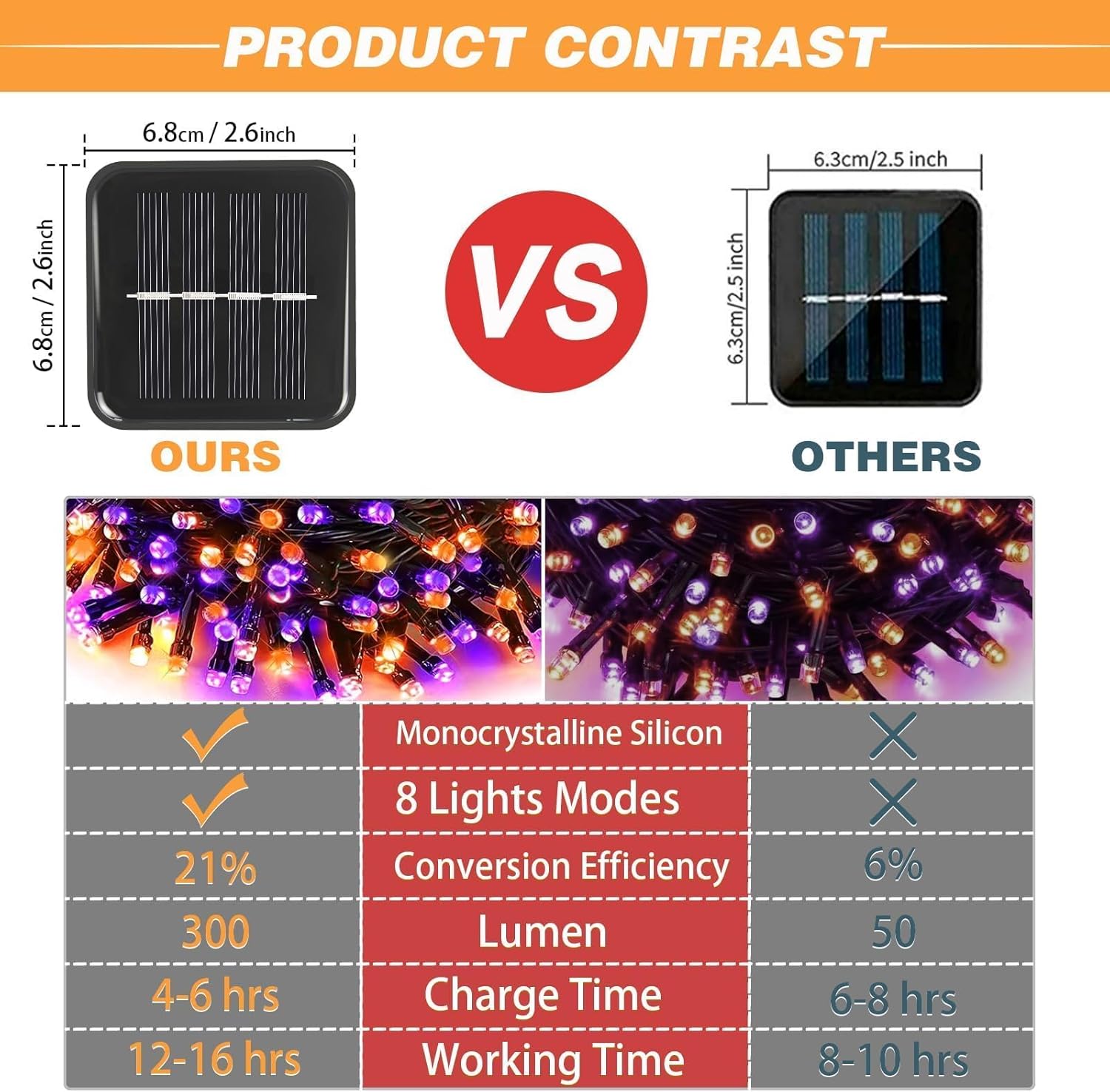 • 【Advanced Monocrystalline Silicon & IP65 Waterproof Level】Solar lights outdoor use more advanced monocrystalline silicon solar panels, which can receive, store and release solar energy more efficiently, and the solar energy conversion rate has increased by 21%. This means charging time is only 5-6 hours and battery life is up to 10-12 hours. The solar string lights outdoor waterproof up to IP65 waterproof rating, no need to fear any weather!