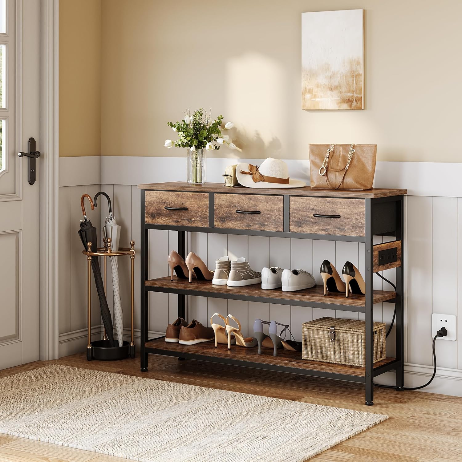 - Console Table with Storage: The entryway table comes with 3 fabric drawers to "keep clutter away". Great for storing goodies like keys, hats, gloves, cookbooks, remote controls and extra cables etc