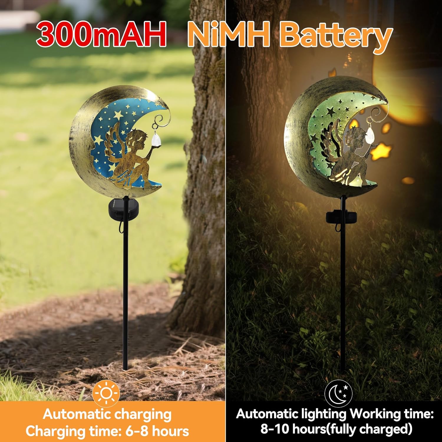- Unique Celestial Design: The solar garden stake light features a serene angel resting on a crescent moon, surrounded by twinkling stars and a crystal pendant in hand, symbolizing peace, hope, and spiritual light; it adds a spiritual touch to your garden