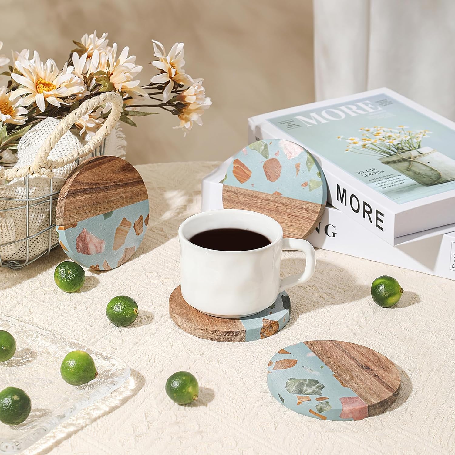 - Natural, Durable Materials: Meticulously crafted from natural acacia wood and genuine marble, these cute cup coasters blend organic warmth with stone elegance. The durable wood resists deformation while the polished marble surface ensures lasting protection, maintaining refined aesthetics through daily use.