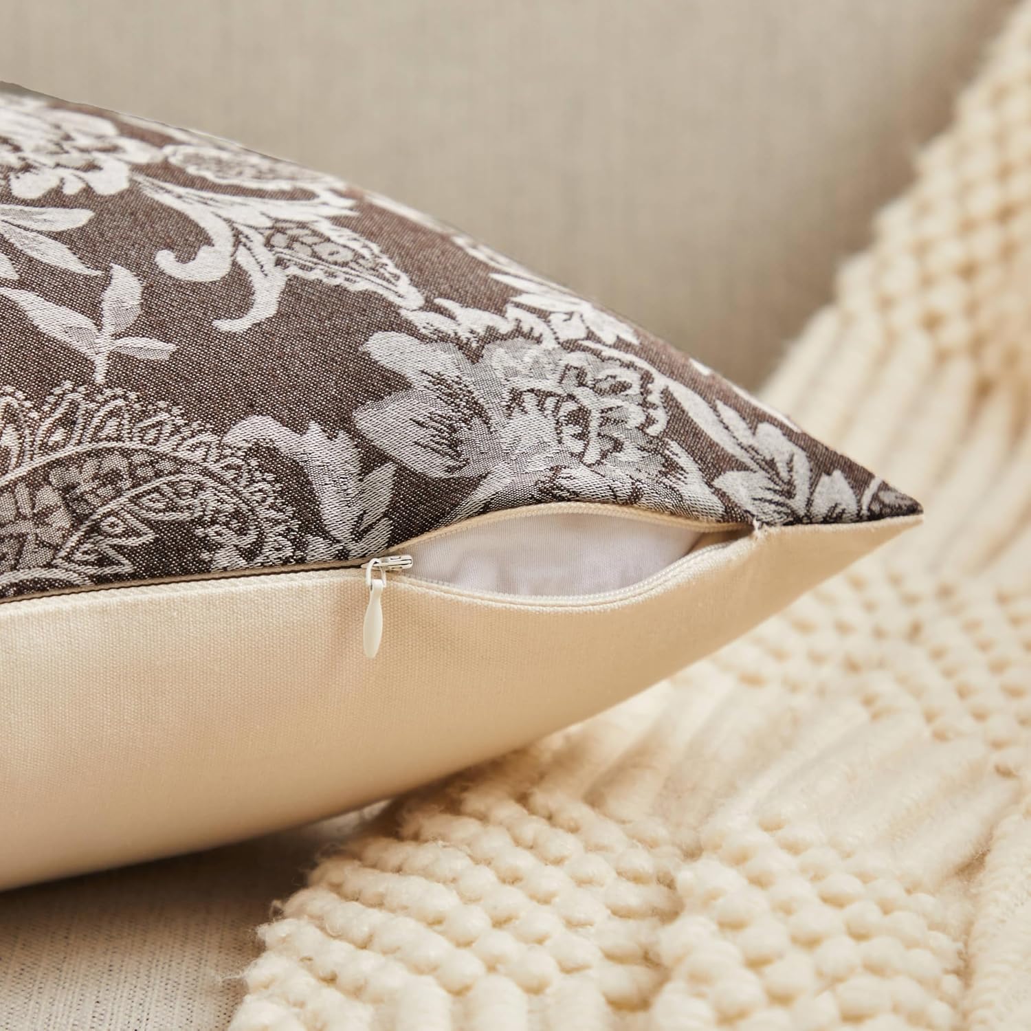 Floral Jacquard Throw Pillow Covers Set of 2, Background/Chocolate 20x20 Inch, Farmhouse Decorative Cotton Dark Brown Cushion Covers for Sofa Bed Living Room Home Decor