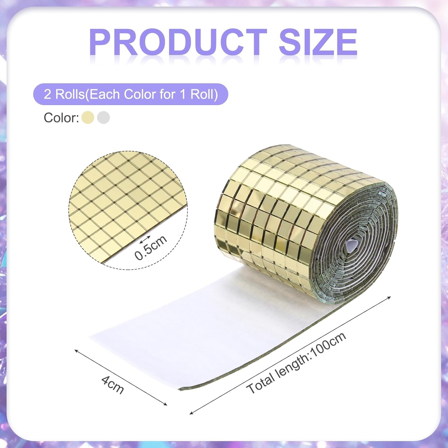 - we provide here, are in the size of: Size: Each roll measures 4 x 100cm (total 2 meters) ; Material: glass with strong adhesive backing ; Color: 1 roll of Gold + 1 roll of Silver (total 2 rolls) ; In the package of: 3200 Pieces Adhesive Mosaic Tiles 5 x 5 mm Disco Tiles 2 Rolls (Gold & Silver)
