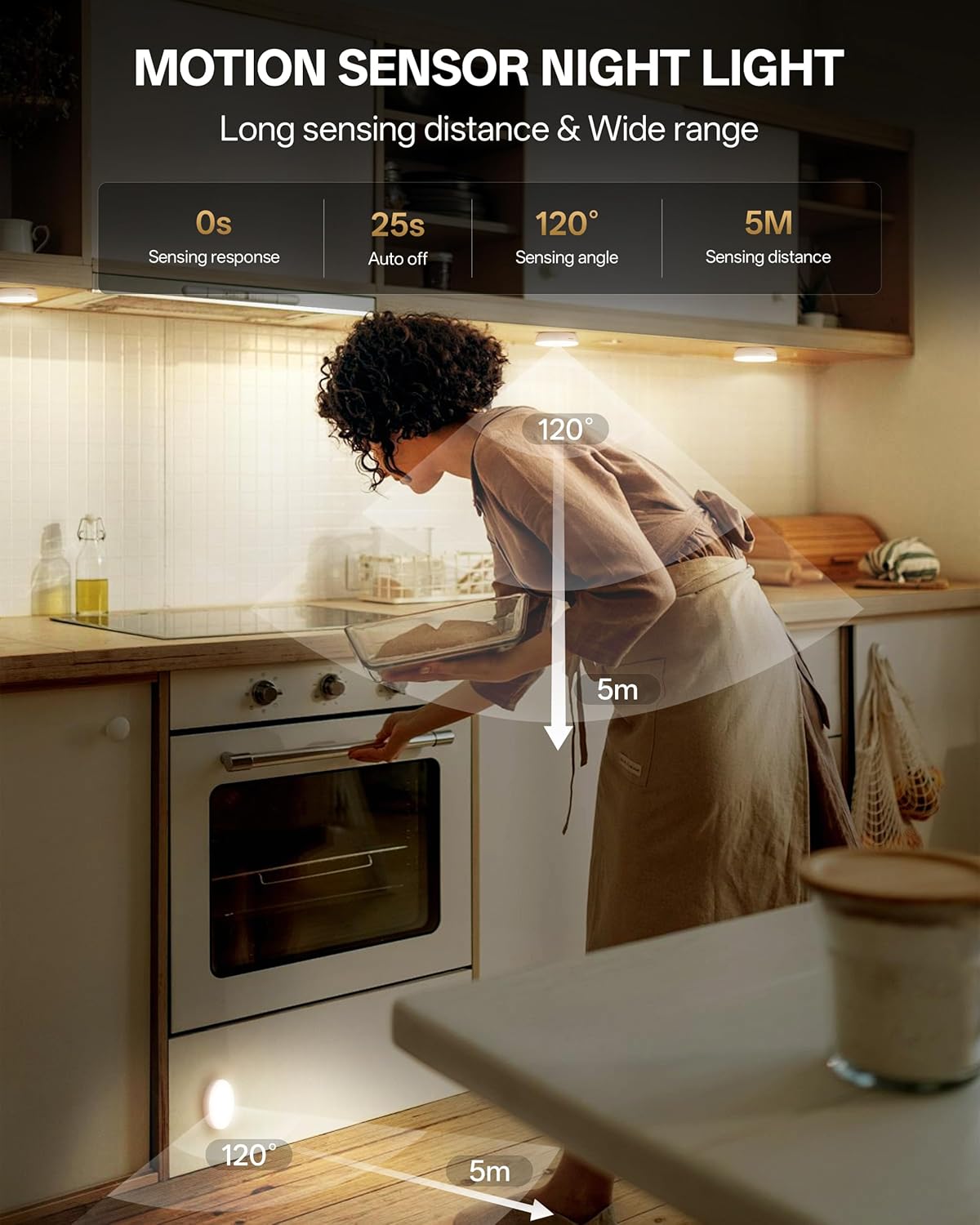 - ă Motion Sensing & 3 Mode OperationăIndustrial-grade 120° wide-angle sensor detects movement within 16ft (5m) radius. Customize illumination with: Smart Daylight Mode: Auto-adapts to ambient light - activates all day only when Lux <60. Night Auto Mode: under cabinet lighting wireless only activated in a dark enviroment. Tips: if no motion is detected in 20s after turning on, the motion sensor closet lights will turn off for energy conservation. Always-on Mode-press the "ON" button on remote control in AUTO mode