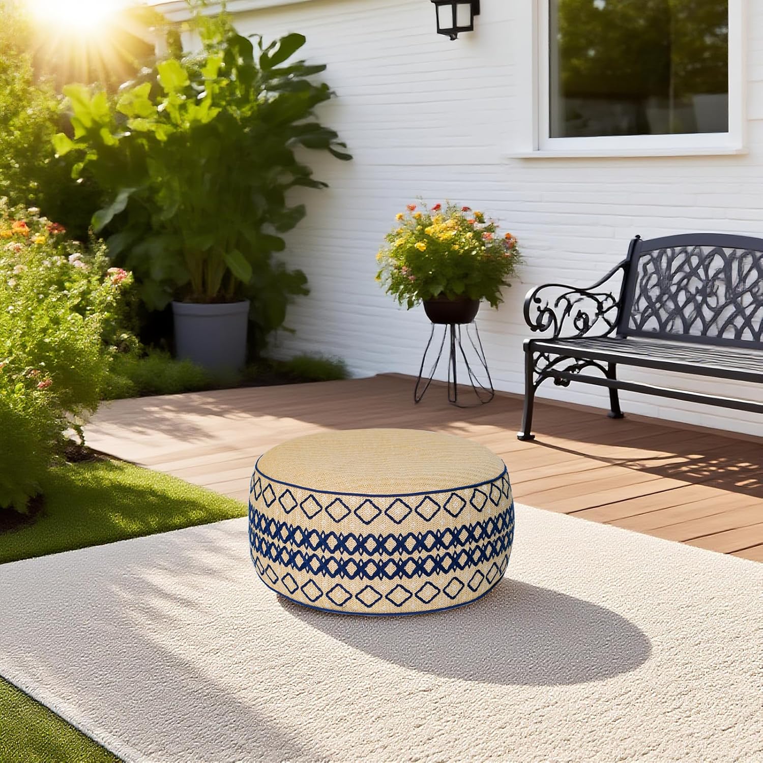 Outdoor Inflatable Ottoman with Air Pump, Embroidery Patio Footrest Stool D21”x H9”, Round Pouf Ottoman with Portable Handle Suitable for Garden, Camping, Bedroom, Living Room