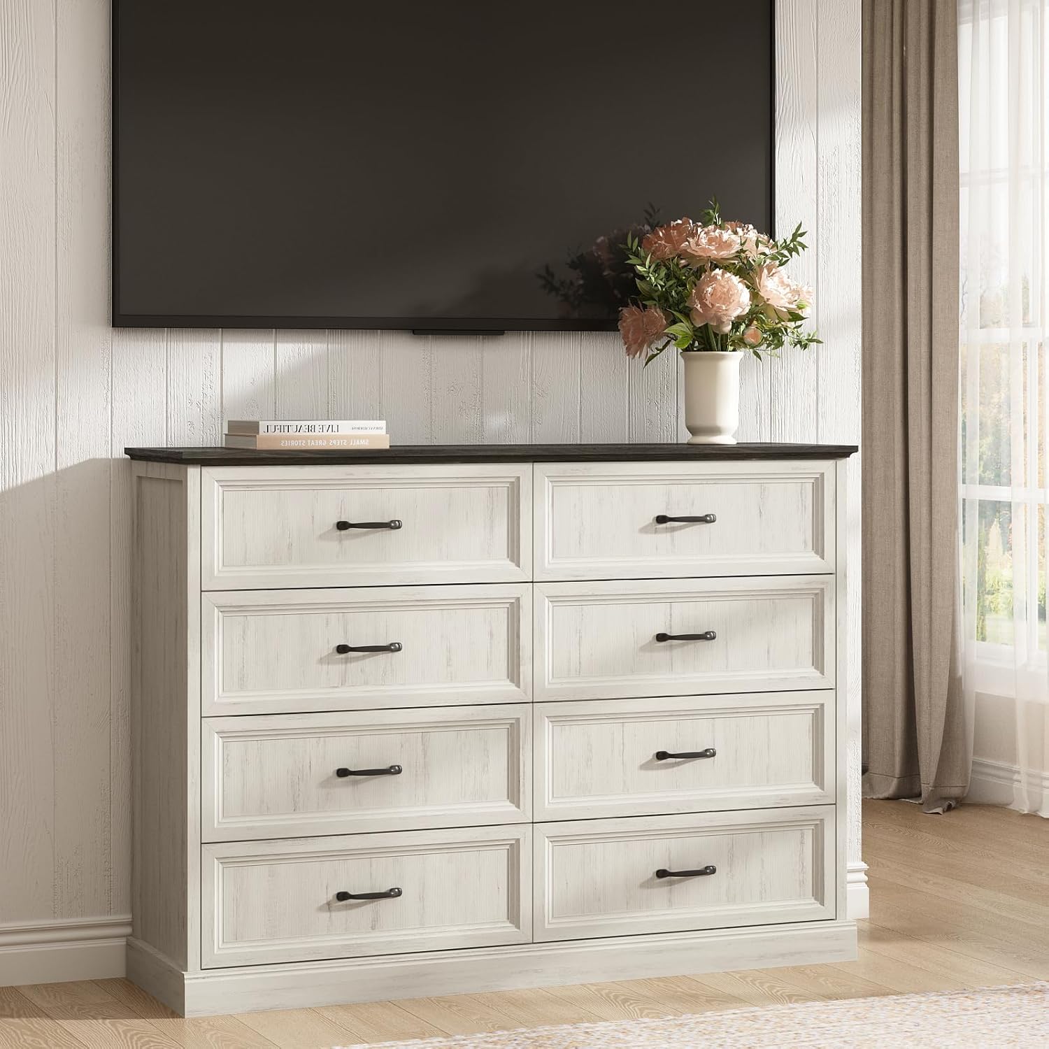 CARPETNAL Farmhouse 8 Drawer Dresser for Bedroom, 55" Wide Modern White Dresser TV Stand with Large Drawers & Bar Handles, Rustic Wood Chest of Drawers for Bedroom, Living Room, Hallway, Entryway.