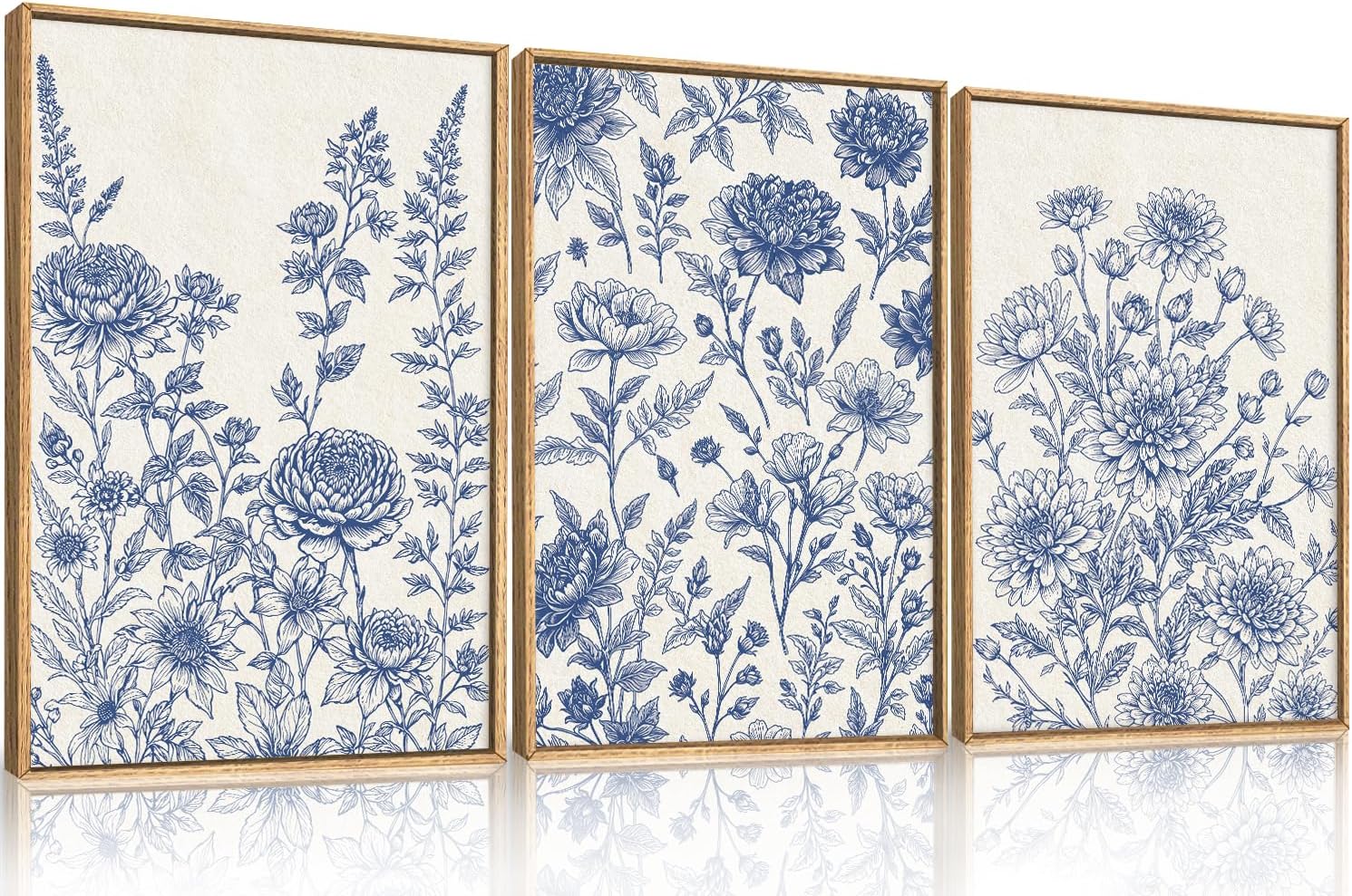 Classic Chinoiserie Floral Framed Canvas Wall Art Set, Blue and White Flower Wall Decor, Navy Watercolor Wall Painting, Minimalist Wildflower Art Print for Living Room, Bedroom - 24"x36"×3