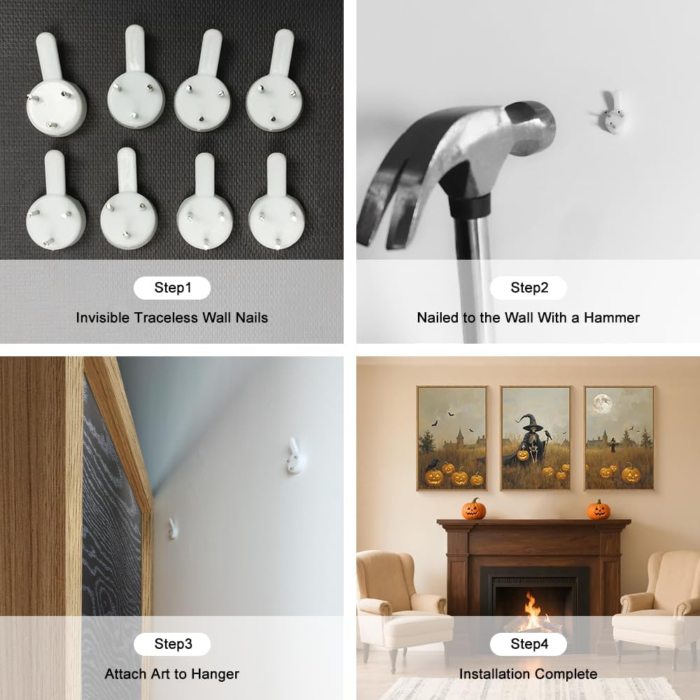 - [Easy To Hang] The size of this witchy halloween night wall painting is 16x24 inches (40x60cm). With the provided hanging kit, it's easy to display this artwork. Simply measure your wall space, hang it up, and enjoy the transformation of your space into a halloween themed one.