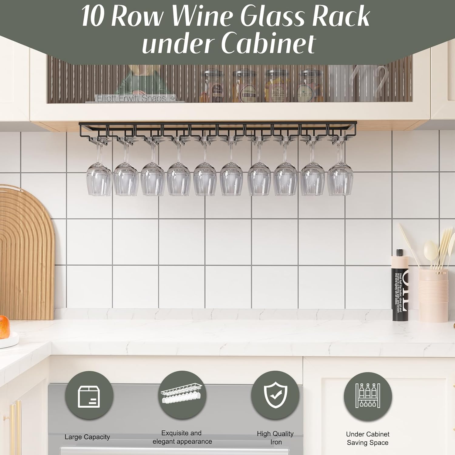 Xverycan Wine Glass Rack Under Cabinet, 10 Row Extreme Large Stemware Hanger, Metal Wine Goblet Holder, DIY Bar Glass Storage Rack for Bar Counter, Kitchen, Screws Included