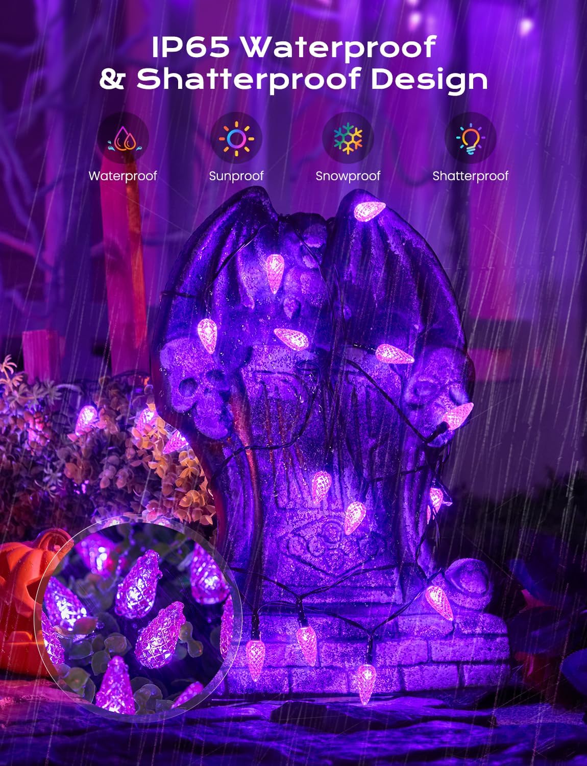 - [IP65 Waterproof] Sturdy plastic housing, waterproof plastic strip, enable the Halloween lights to prevent rain and water from entering effectively. Perfect for indoors and outdoors Halloween decoration, such aspatio railing, front door, house eaves, front porch, gazebo canopy, backyard, balcony railing, outside front window, front deck railing, front yard, Halloween tree etc
