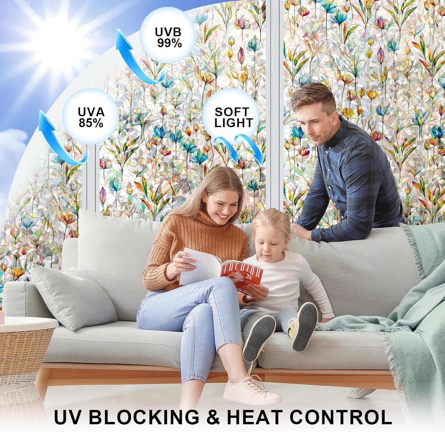 Rainbow Window Privacy Film 3D Floral Decorative Stained Glass Window Film Anti UV Non-Adhesive Reusable 23.6" x 78.7" for Home Room Car Glass Cling
