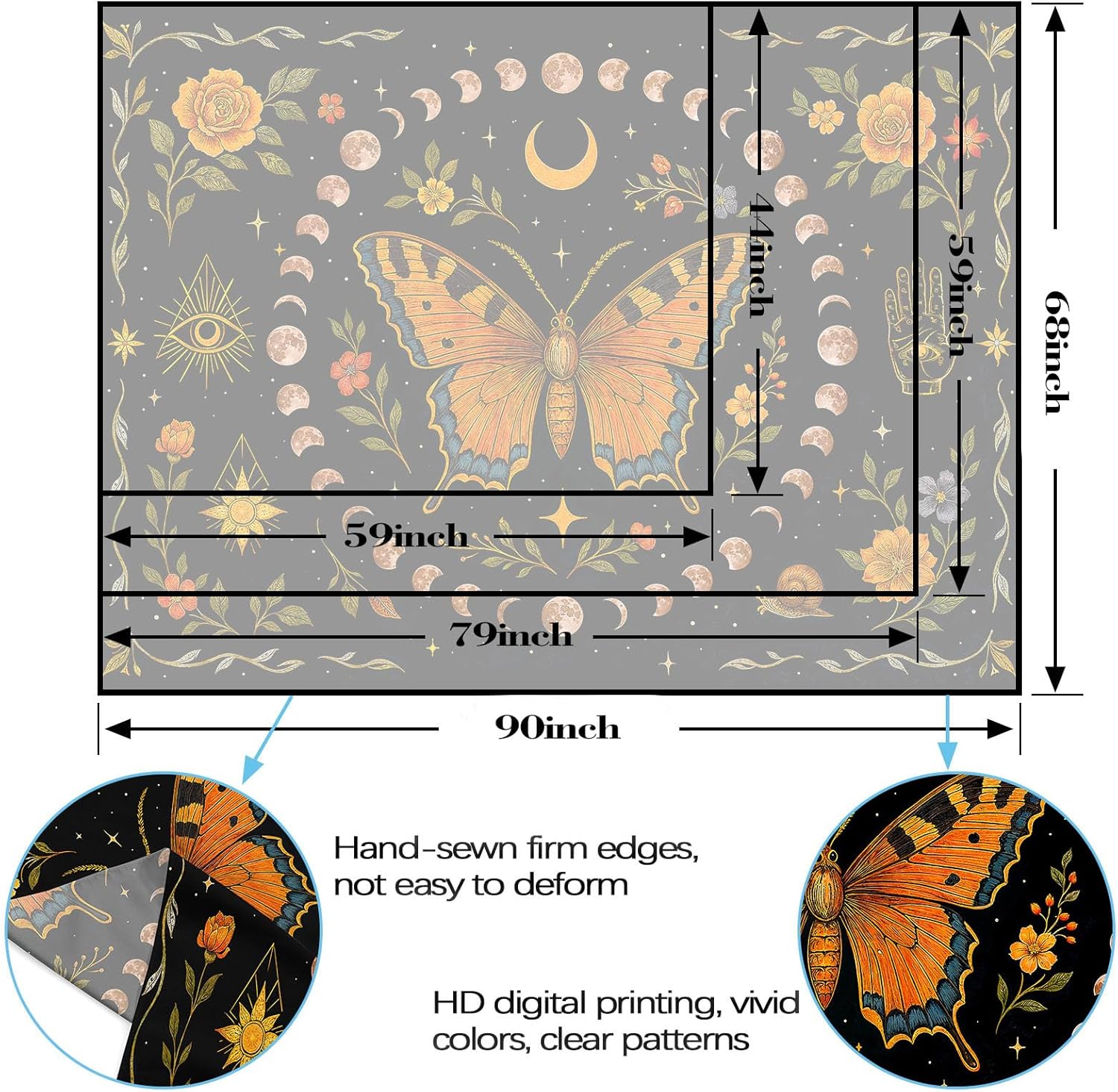 - Rich, Detailed Imagery: Printed with high precision on durable fabric, displaying intricate patterns and a palette of warm and dark, enchanting colors.