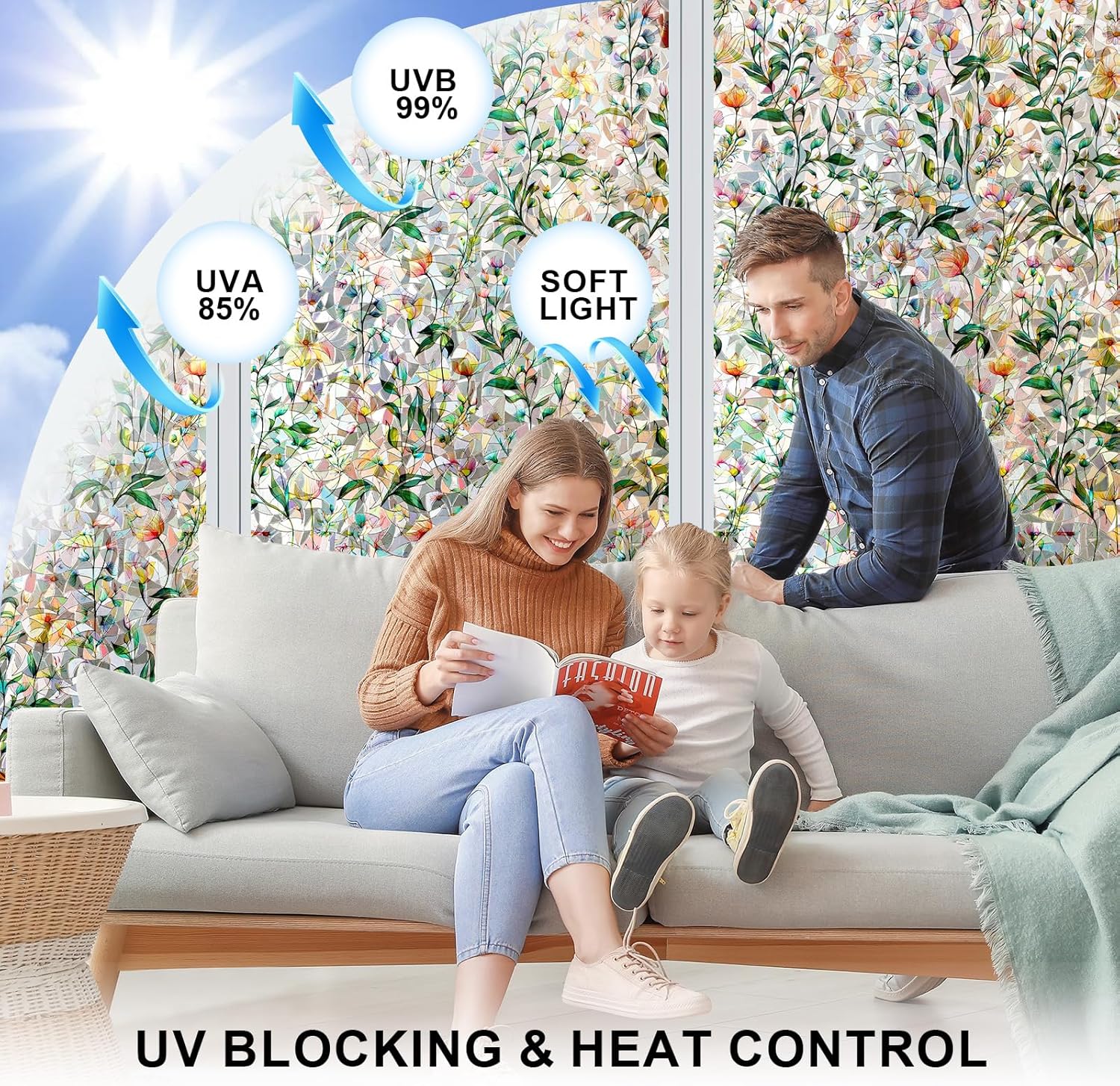Rainbow Window Privacy Film 3D Floral Decorative Stained Glass Window Film Anti UV Non-Adhesive Reusable 23.6" x 78.7" for Home Room Car Glass Cling