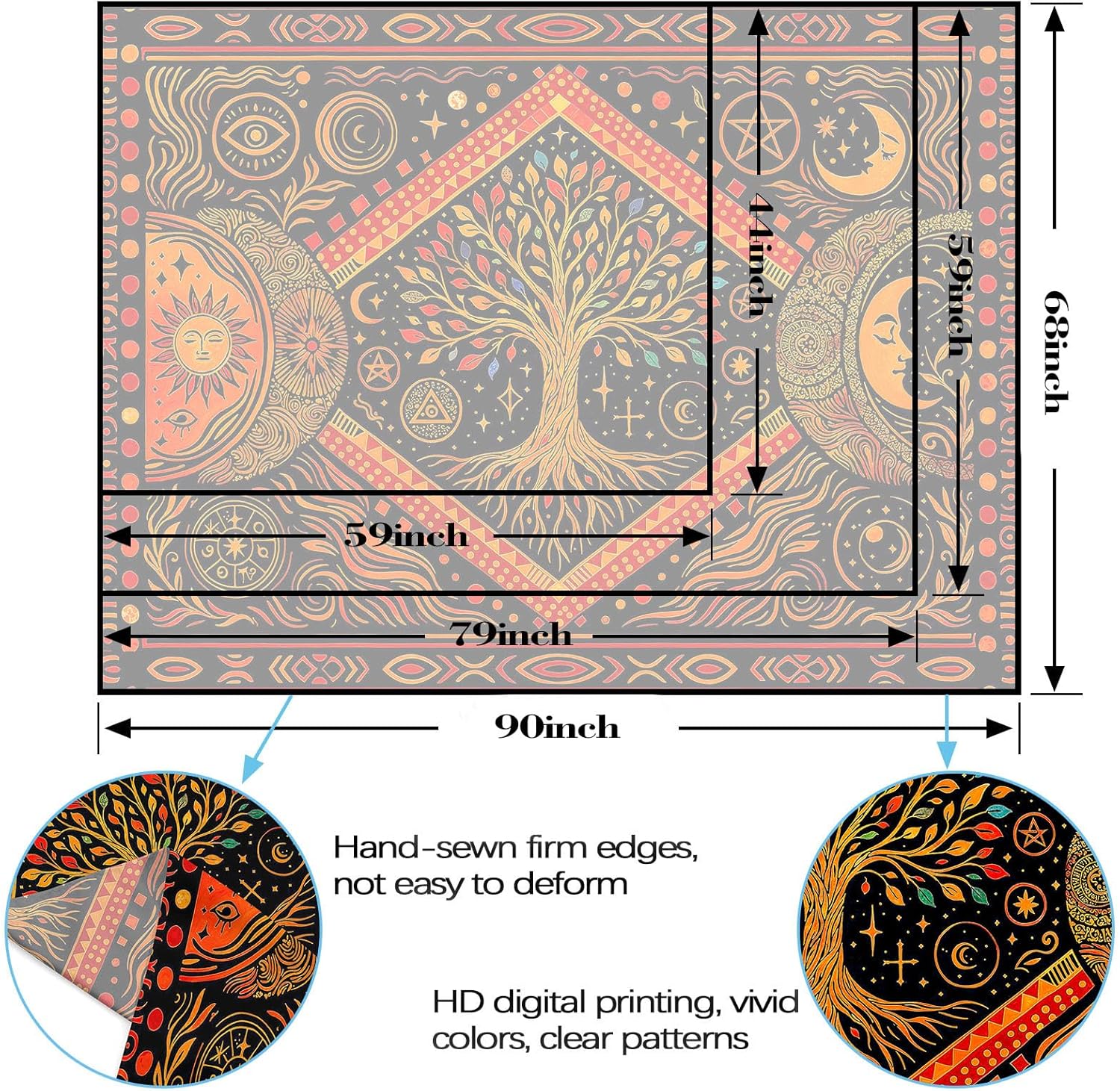 - Symbolic Cosmic Design: Features a central Tree of Life surrounded by sun, moon, and star motifs, adorned with intricate patterns in rich, contrasting colors.