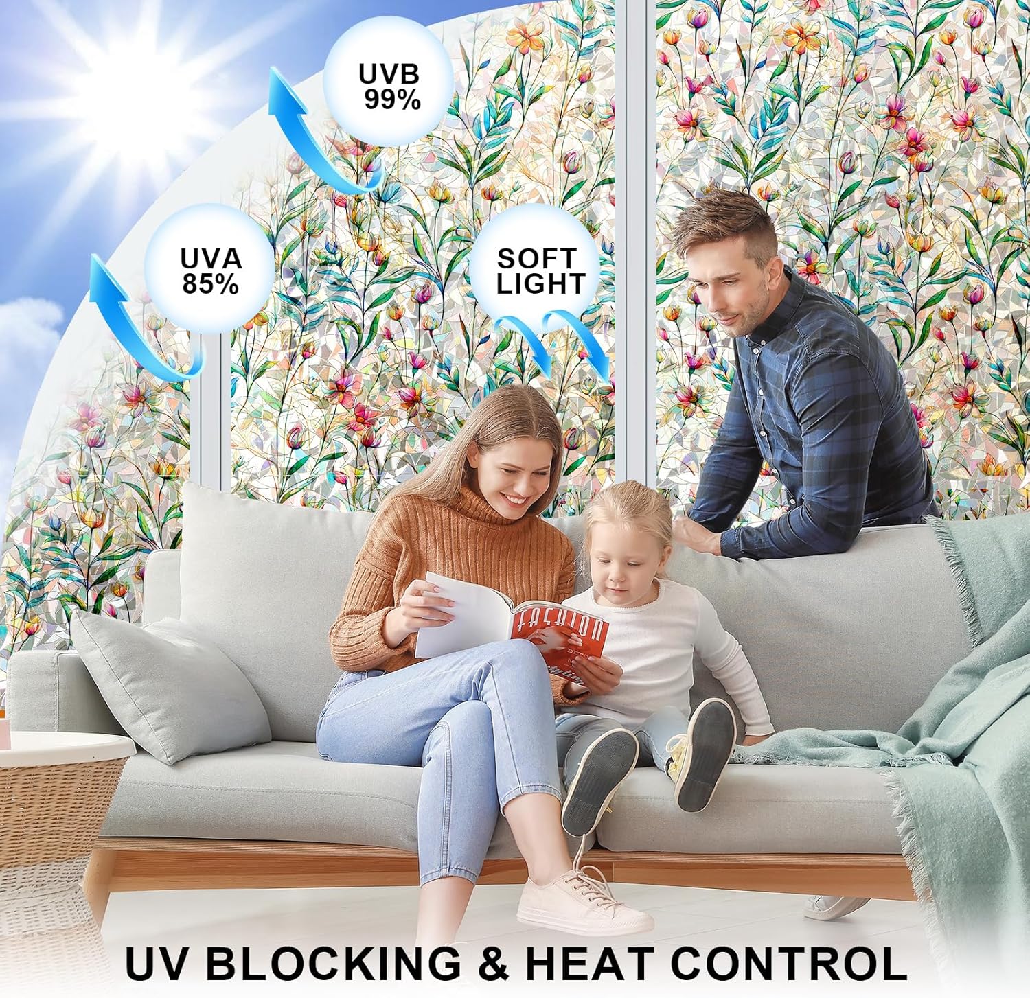 Rainbow Window Privacy Film 3D Floral Decorative Stained Glass Window Film Anti UV Non-Adhesive Reusable 17.5" x 78.7" for Home Room Car Glass Cling