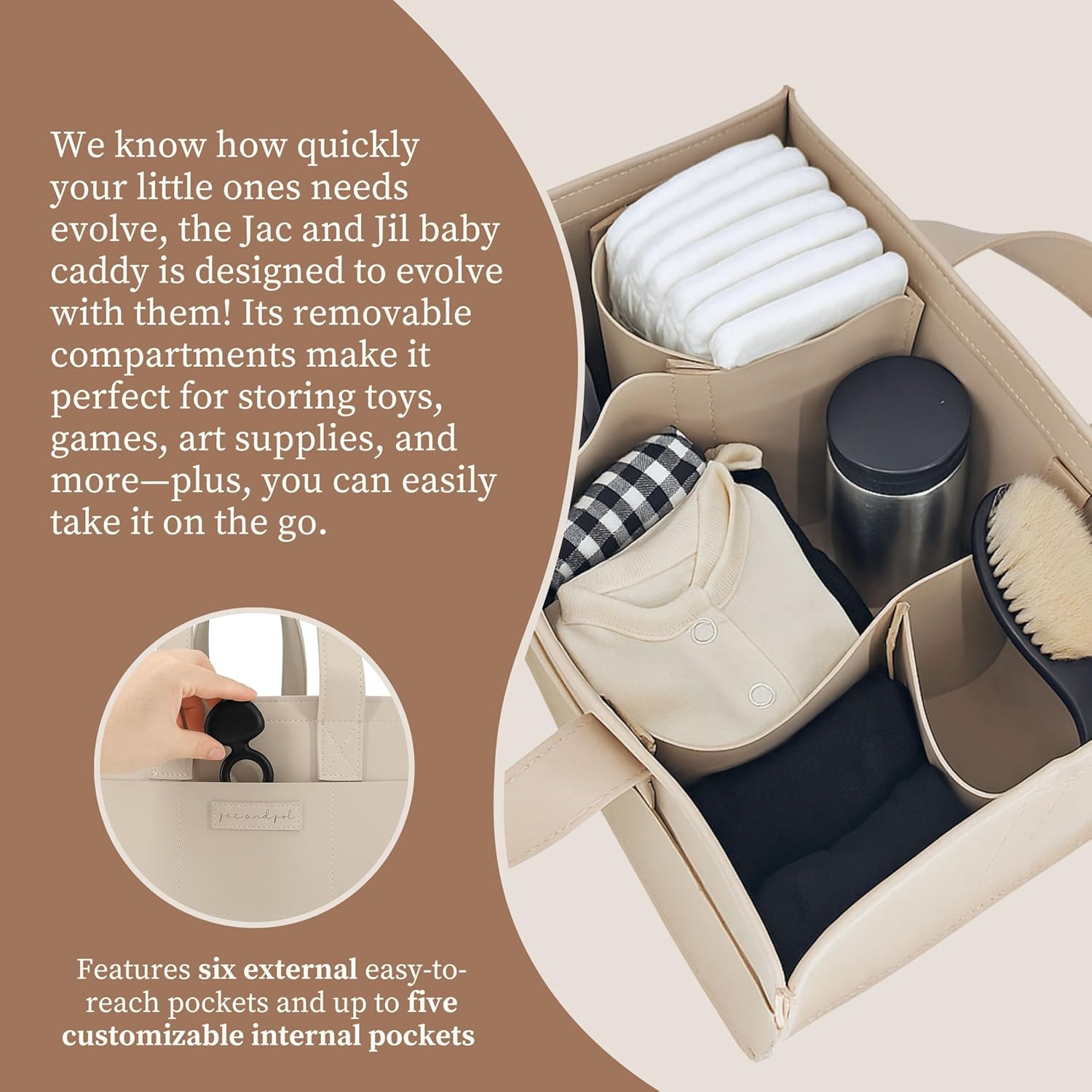 - [CUSTOMIZABLE REMOVABLE DIVIDERS] – Designed to grow with your child, this versatile caddy features 4 sturdy, high-quality Velcro-secured dividers that can be rearranged or removed to suit your changing storage needs. Whether organizing newborn essentials or toddler gear, enjoy a tailored solution that adapts seamlessly to every stage. Our caddy also features 6 external compartments to store easy to reach essentials.