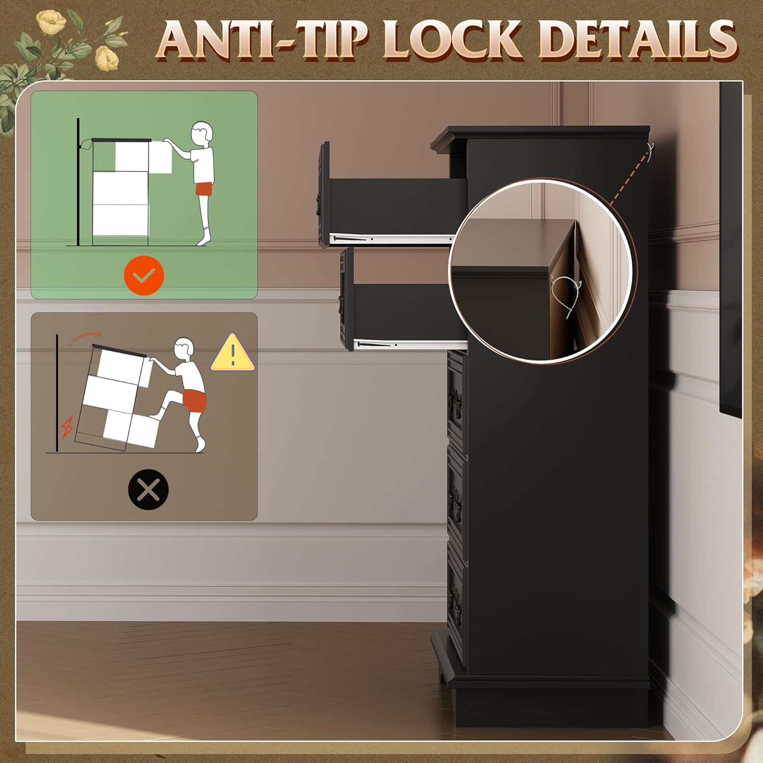 - ăSafe and SturdyăThe dressers & chests of drawers are made of durable engineered wood, featuring a thick tabletop that can support heavy items. Sloping edges and widened legs improve stability. An anti-tipping device ensures child safety by preventing wobbling and tipping.