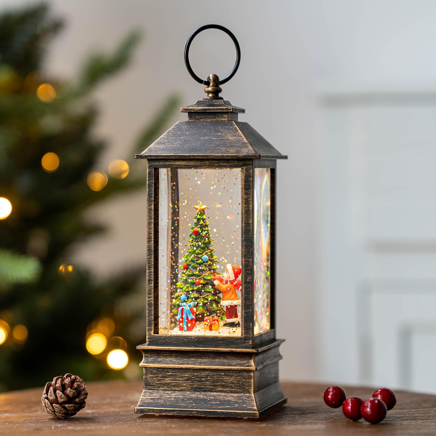 Christmas Snow Globe Lantern Water Glittering Christmas Tree Gifts with Music & Timer, USB Lined/Battery Operated Lighted Lantern for Christmas Festival Decorations