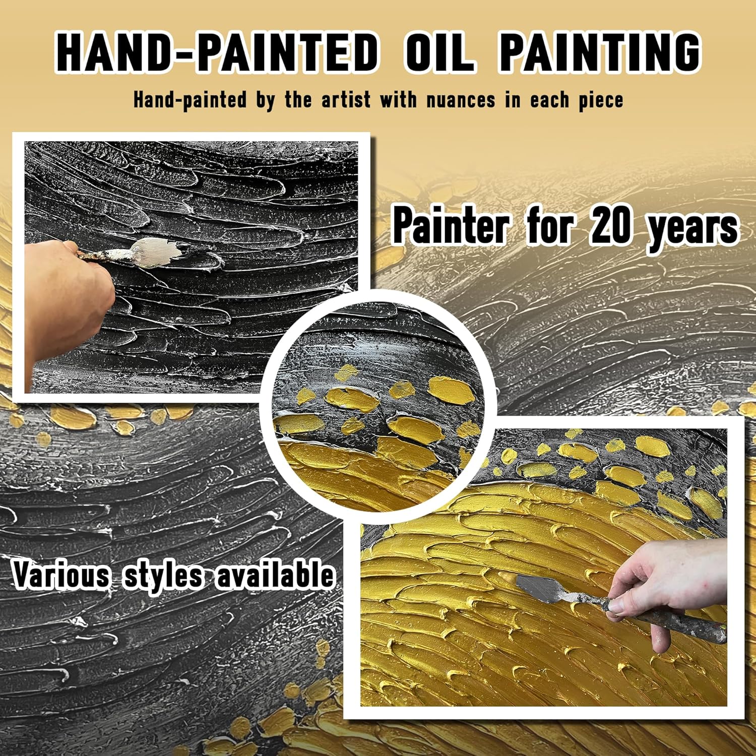 - 【Canvas Mural Size】theme "Black And Gold Abstract" The size is 24" x47". Since each painting is hand-painted, the actual painting may differ slightly from the product image. Due to different monitor brands, the actual wall painting color may be slightly different from the product picture.