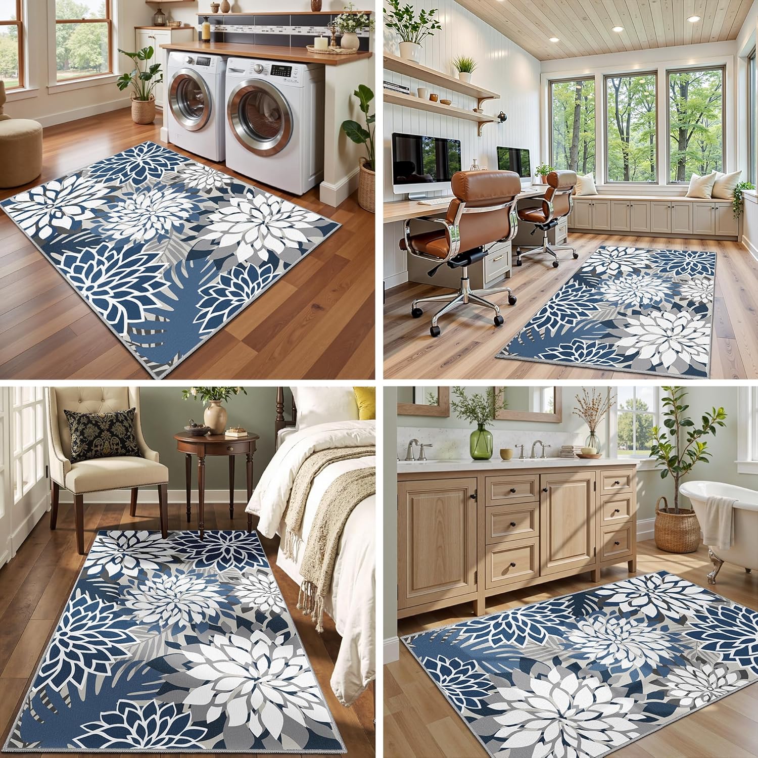 Area Rug 3x5 Blue White Washable Entry Rug Multicolored Tropical Botanical Modern Floral Indoor Kitchen Door Mat Entrance Carpet Non Slip for Bedroom Living Room, Porch