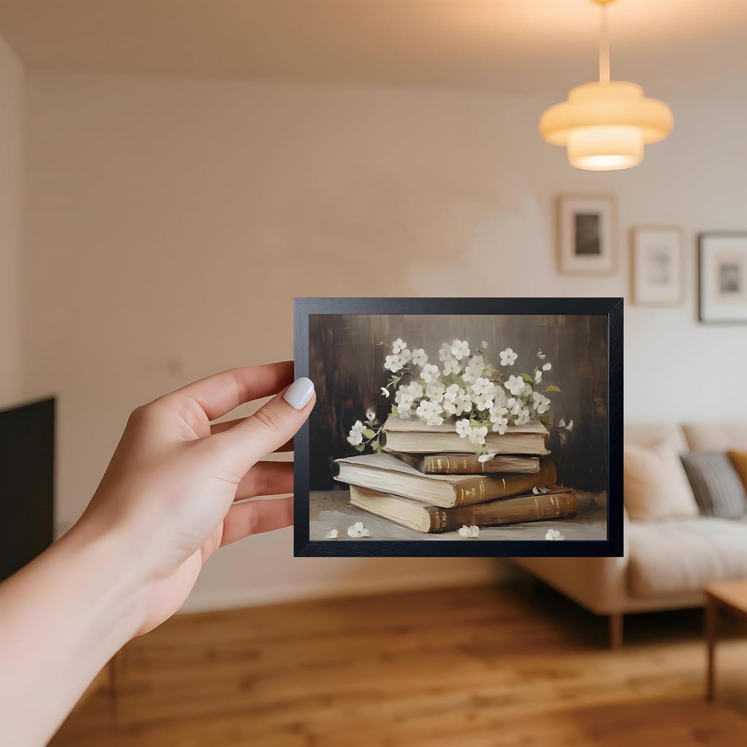 Wood Framed Canvas Poster Print Wall Art, Vintage Floral Book Wall Decor Oil Painting, Dark Academia Room Aesthetics Picture for Bathroom Classroom Dormitory room Decor 8x10 inch